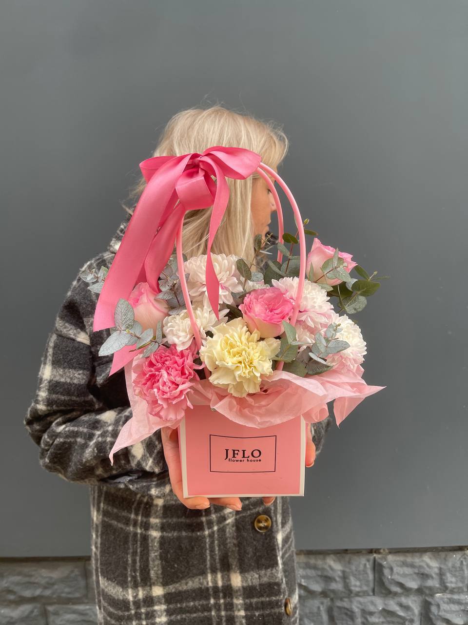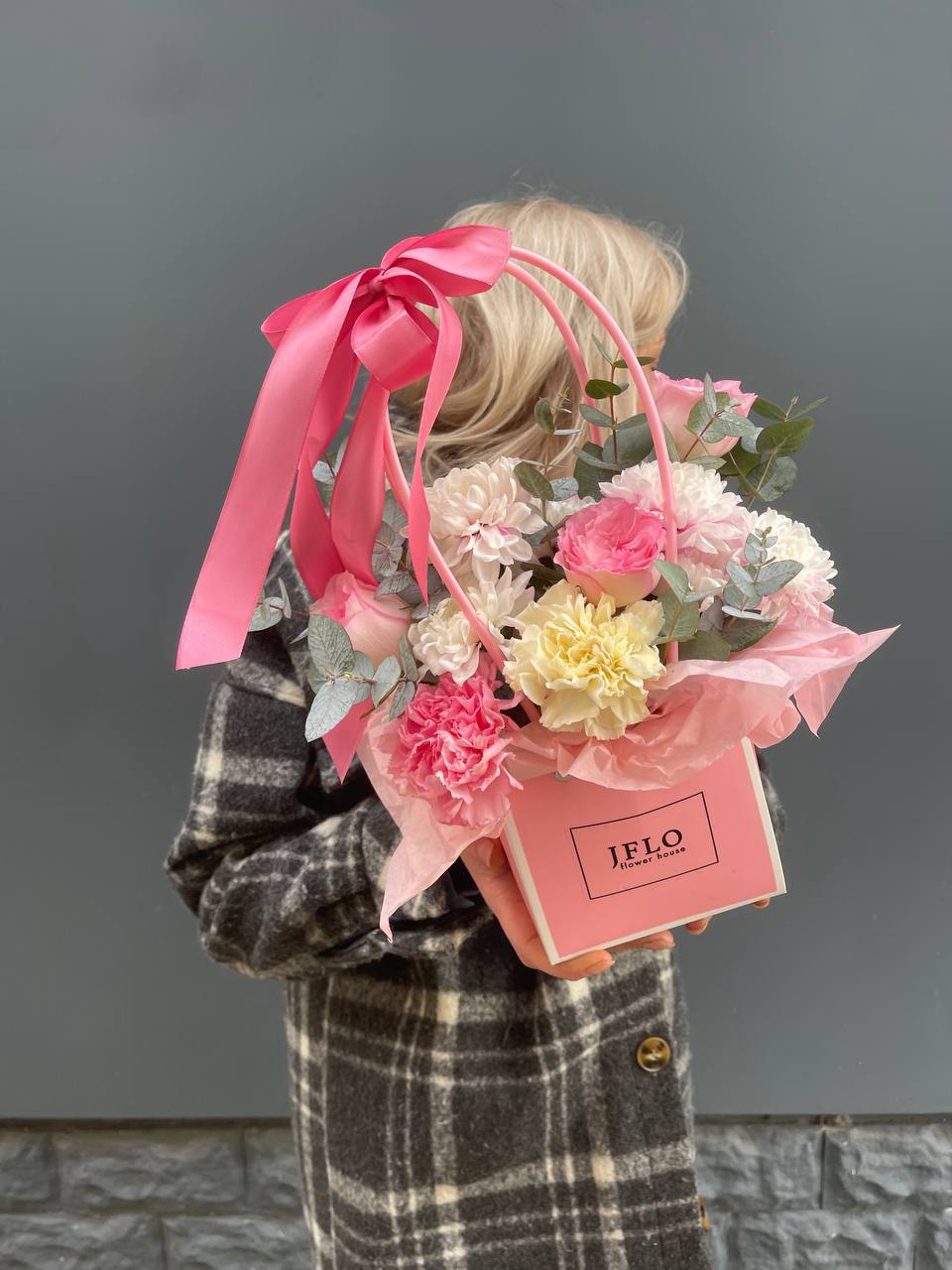 Пышная гортензия задает объем, розовые розы и эустома наполняют композицию мягкими переходами. Диантусы расставляют цветные точки, а эвкалипт придает свежесть всей форме.