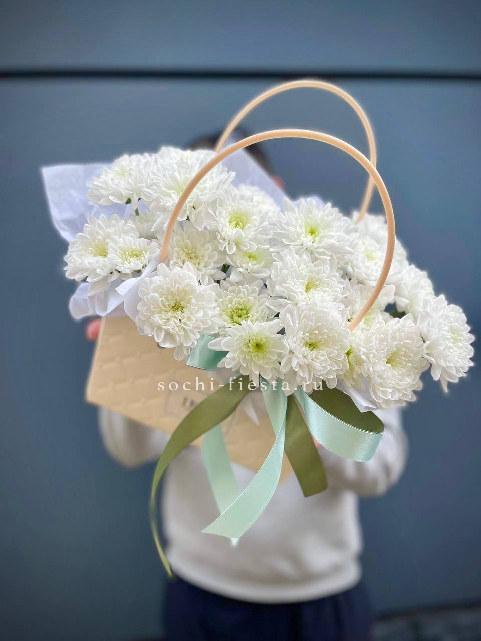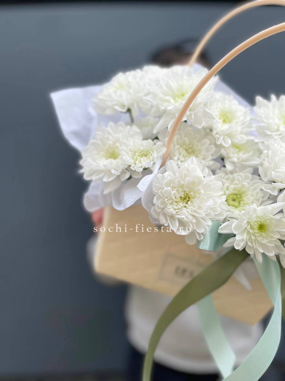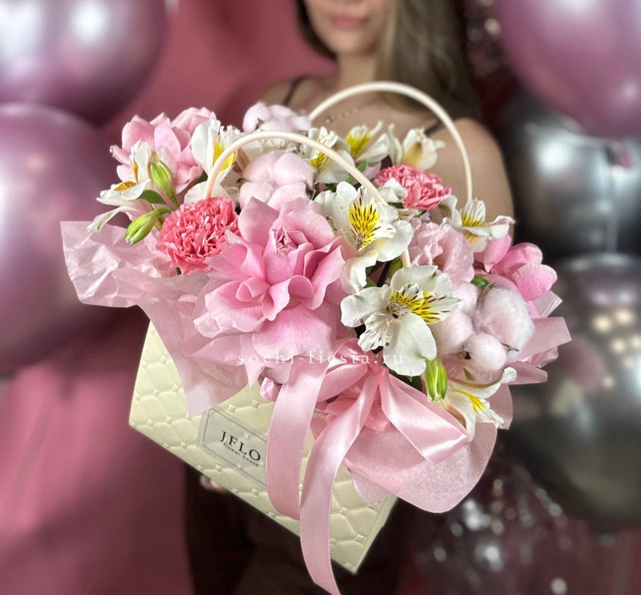Розовые розы и диантусы переплетаются с кустовыми хризантемами в плотной округлой композиции. Альстромерия добавляет графичные акценты между бутонами. Сумочка собирает все элементы в аккуратную форму с естественным объёмом.