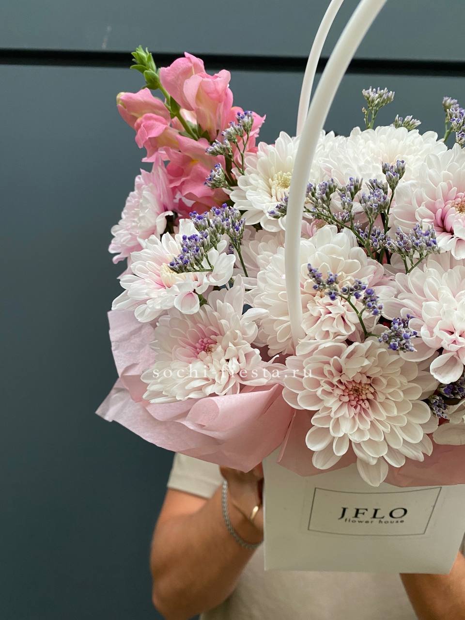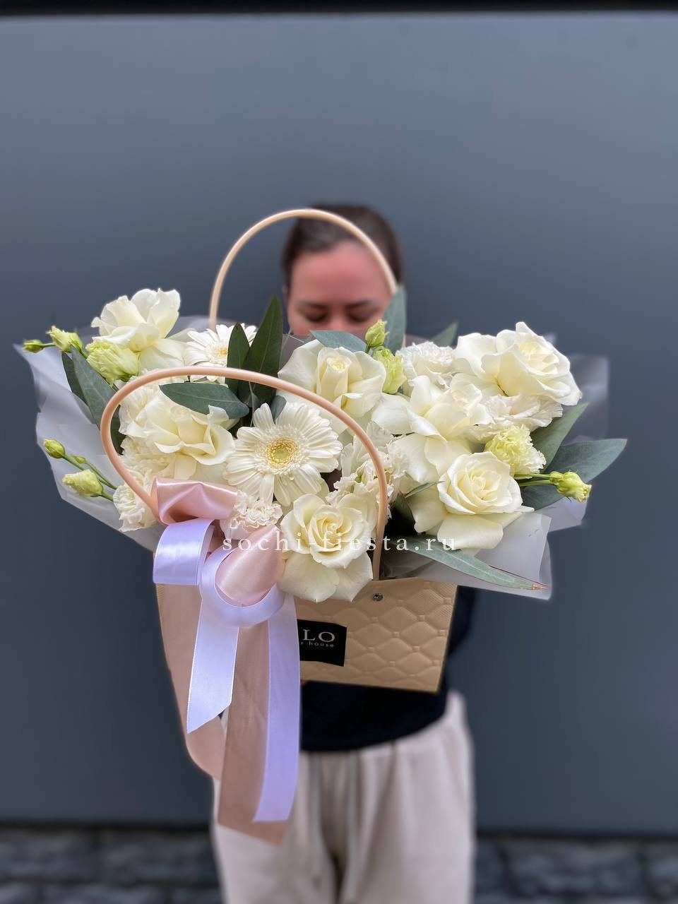 Белые розы и хризантемы сочетаются с воздушной эустомой и хлопком в сумочке. Светлая гамма с прохладным оттенком напоминает морскую свежесть и создает спокойное настроение.