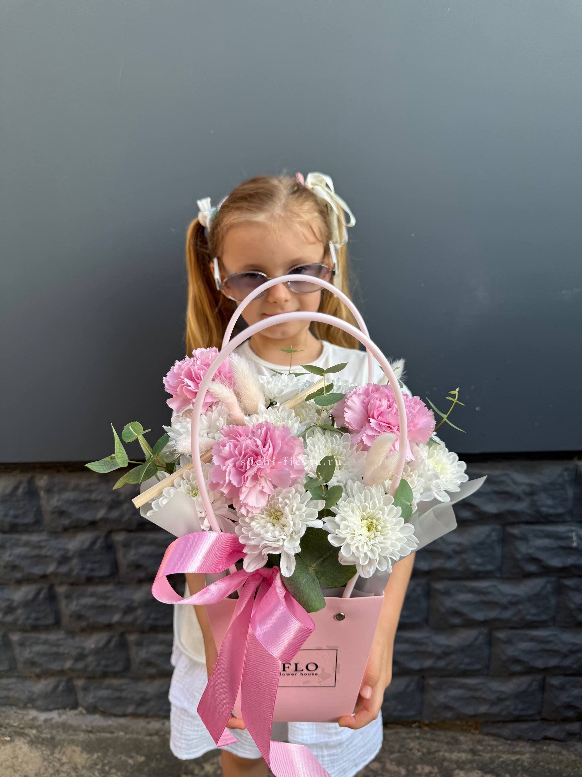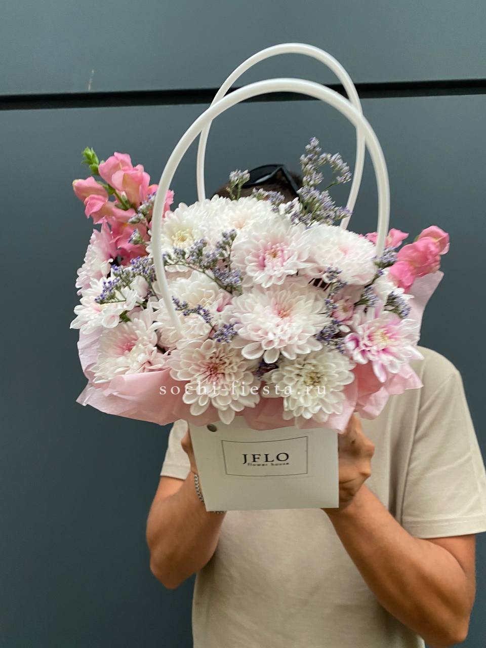 белая роза, хризантема, хлопок, эустома, антиринум, сумочка.