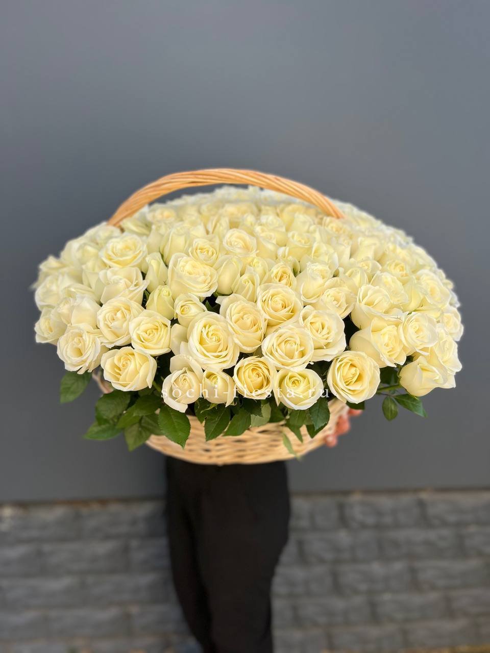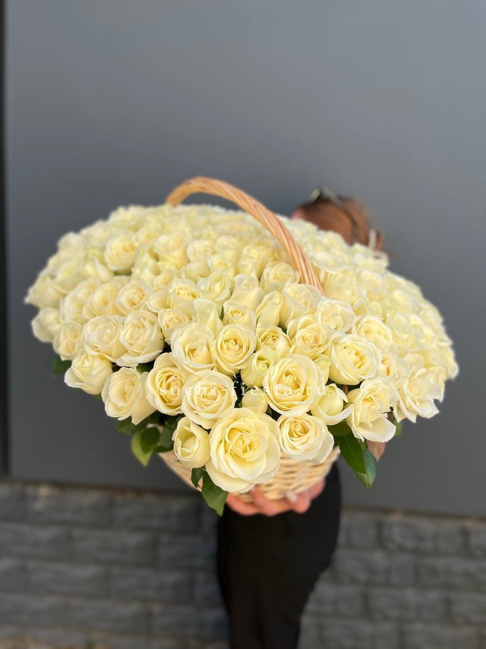 Пышная композиция в корзине собрана из роз двух видов и воздушной эустомы в бело-розовой гамме. Фисташка добавляет свежести, а округлая форма создает ощущение наполненности и объема.