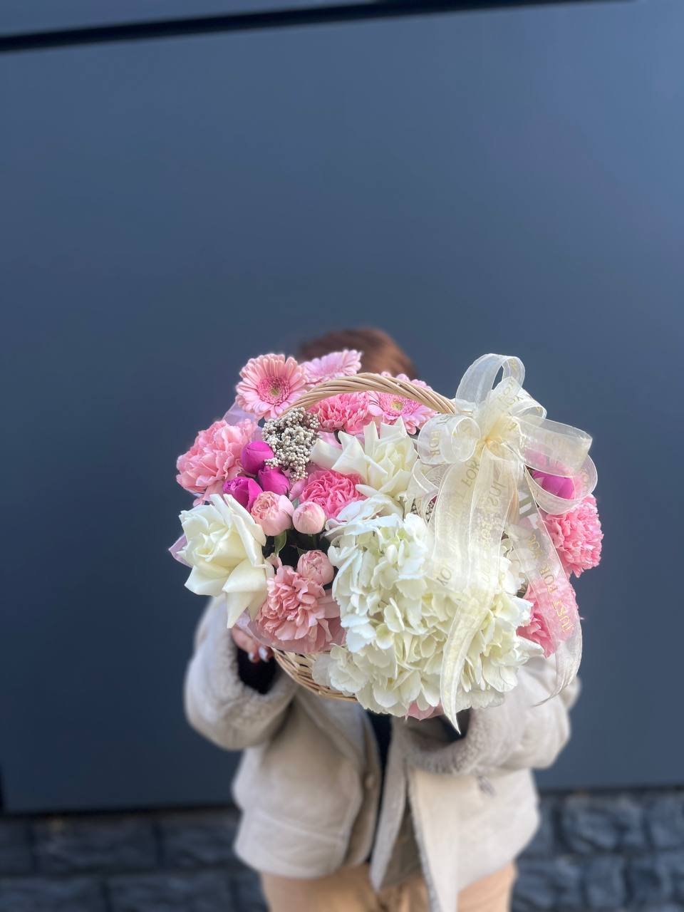 Здесь идеально сочетаются крупные, бархатистые бутоны роз, облака гортензии и мелкие акцентные цветы. Получилась невероятно воздушная и легкая композиция, которая мгновенно создает ощущение праздника и весеннего настроения. Стильный бант завершает этот изысканный образ.