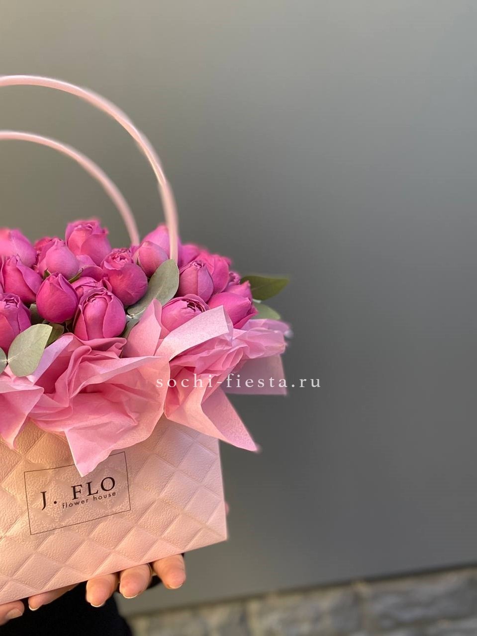 Пять кустовых роз Мисти Бабблс раскрываются пышными головками с волнистыми лепестками. Эвкалипт добавляет свежести и объема. Композиция помещена в удобную сумочку.