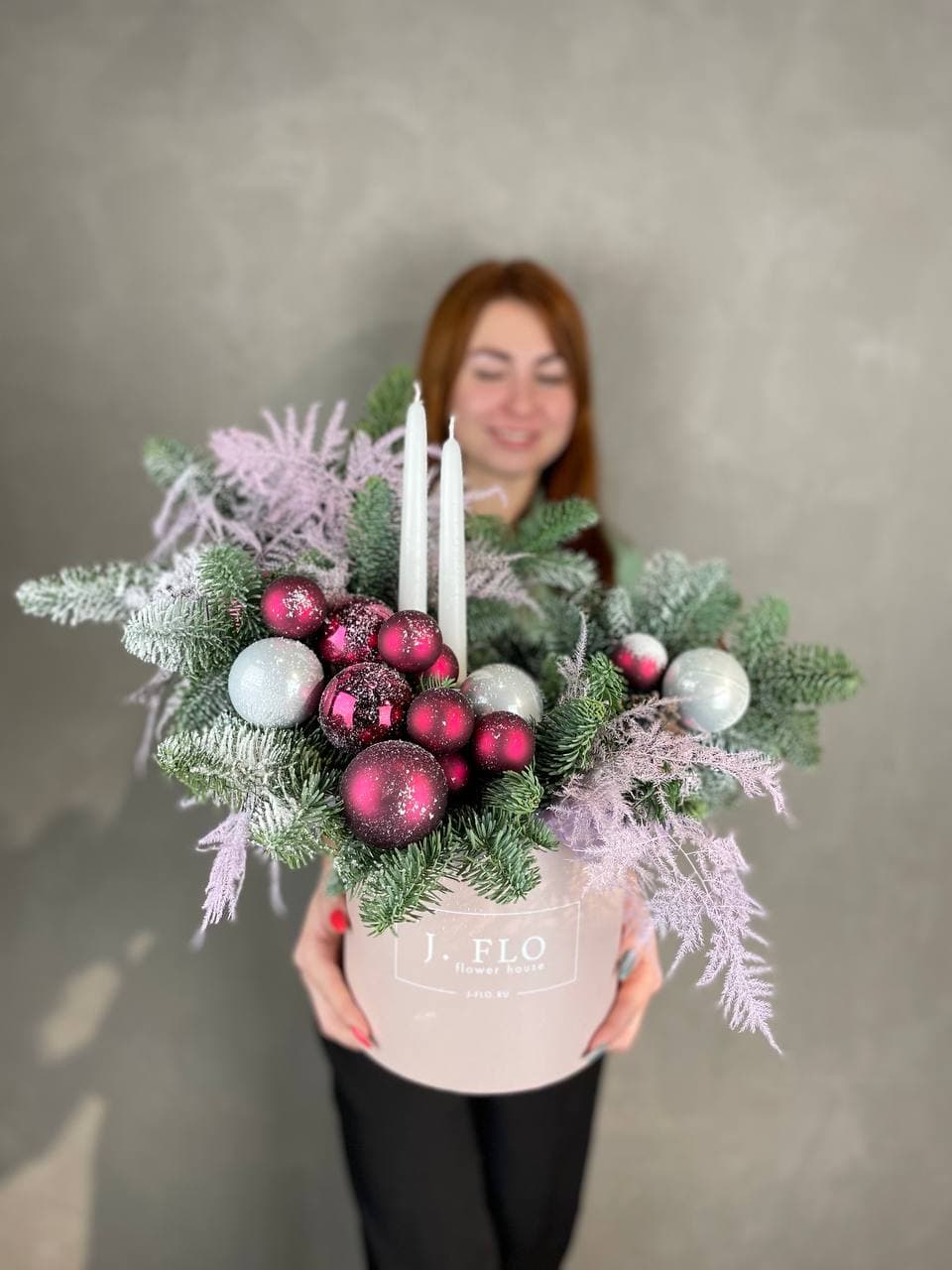 живая ель (датский нобилис), новогодние игрушки, аспарагус, свечи, декор, оазис, бокс D20-25 см Готовая композиция может иметь незначительные внешние отличия от примера на фотографии.