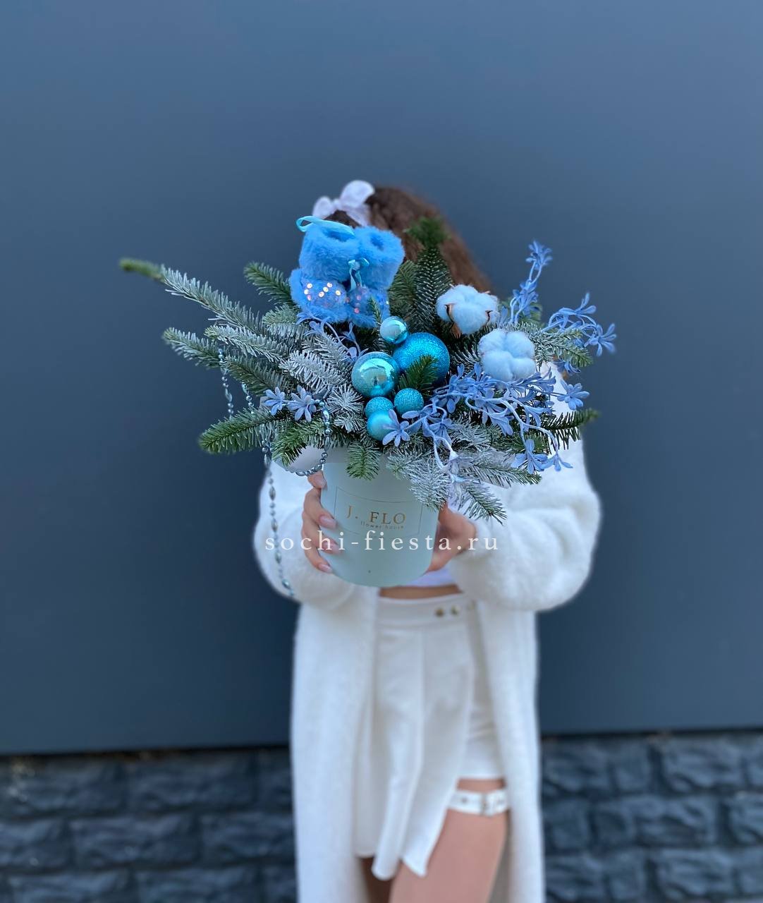 Новогодняя композиция в цилиндре с веточками нобилиса и миниатюрными сапожками создает уютную зимнюю историю. Голубые игрушки и декоративные элементы вносят свежую ноту в традиционную праздничную гамму.