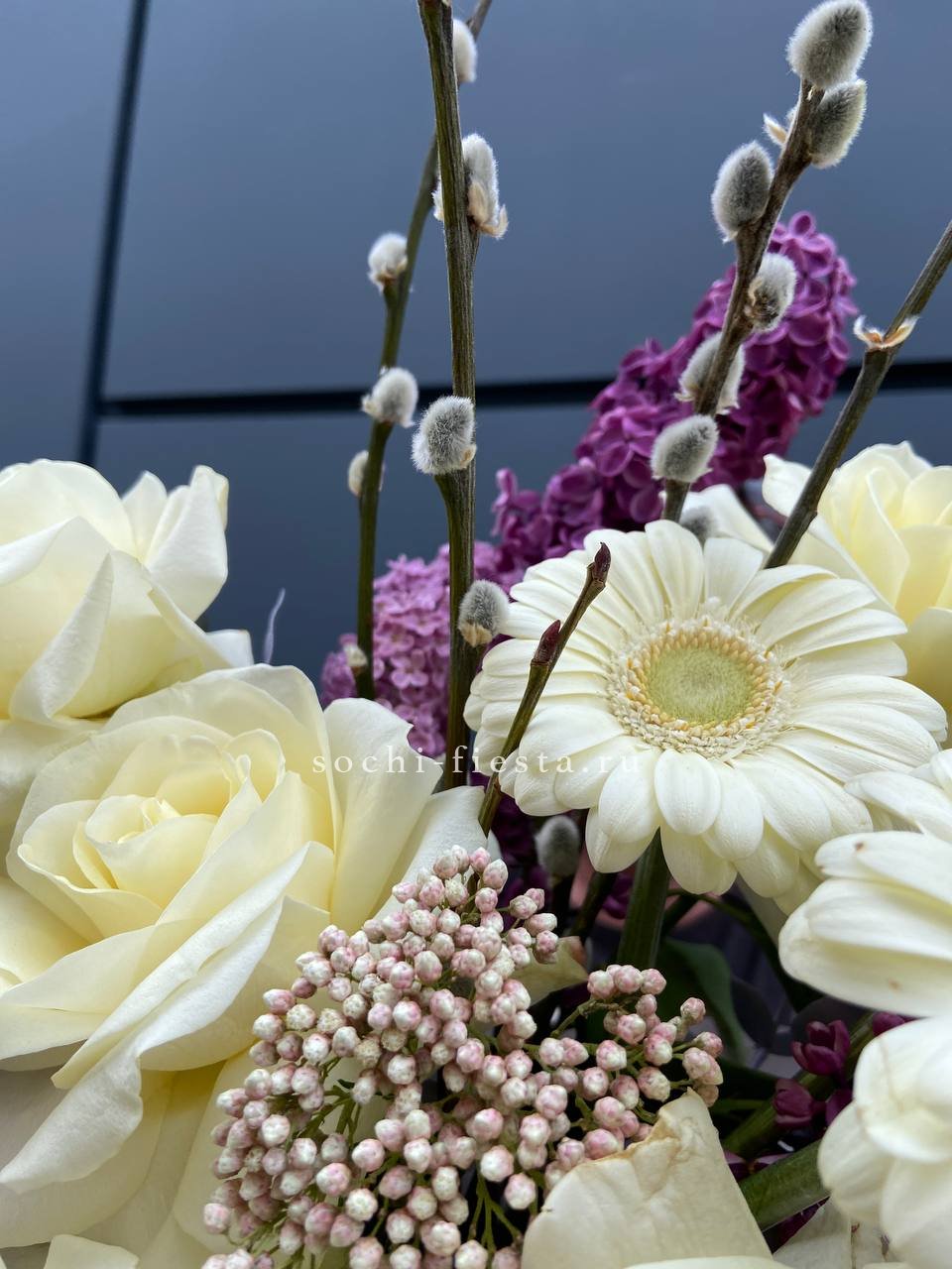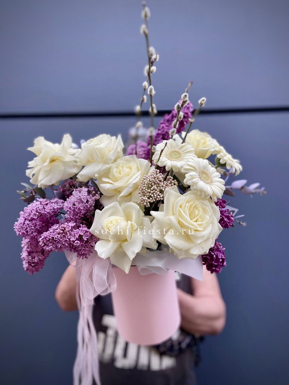 Белые розы и герберы собраны в круглую форму вместе с пушистыми веточками вербы и душистой сиренью. Композиция в коробке держит объём и выглядит цельно. Весенний букет для светлых дней и семейных встреч.