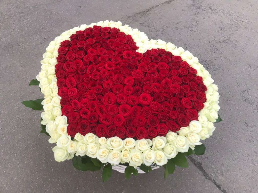 Длинные стебли и крупные бутоны в палитре микс создают букет с графичным силуэтом. Сто одна роза выстраивается в плотную композицию с выразительной вертикалью.