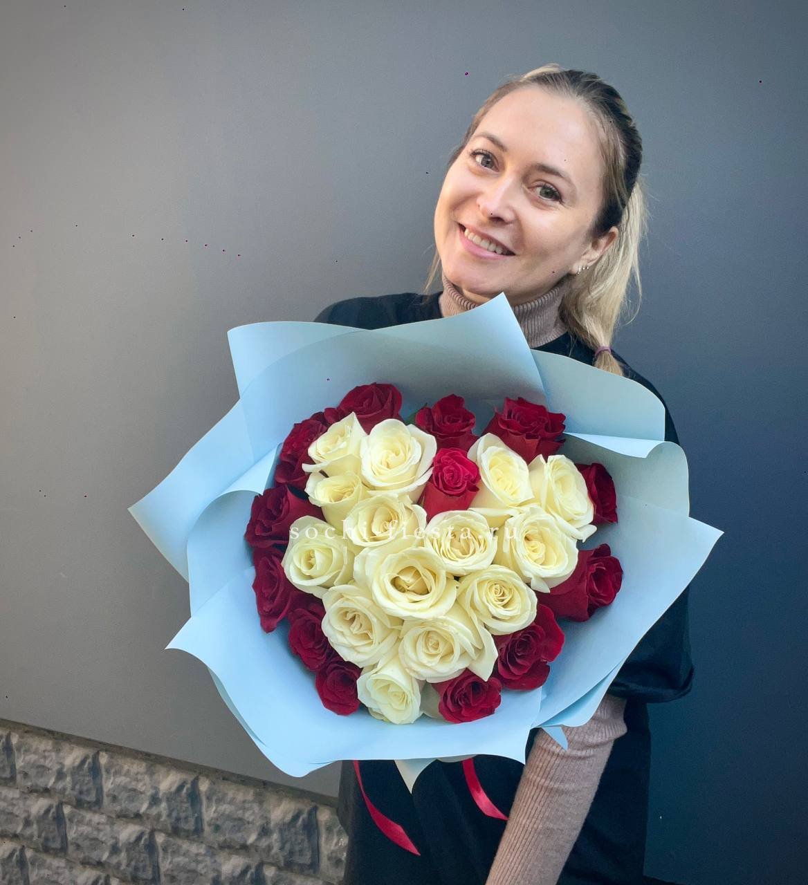 розовые и белые розы - 51 шт., лента, дизайнерская бумага.