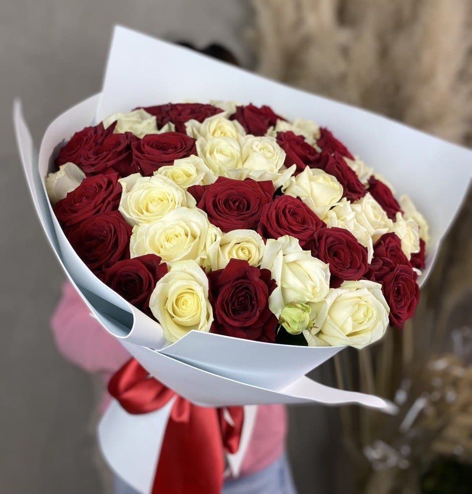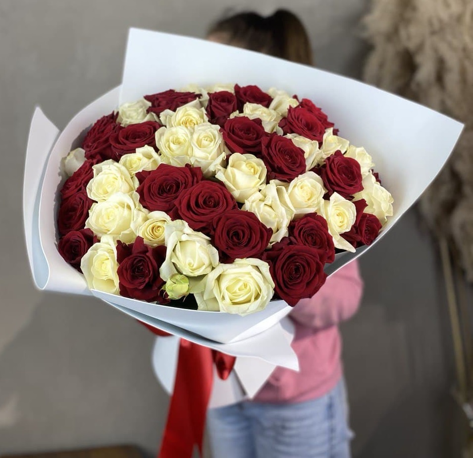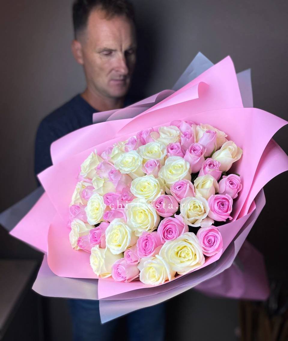 55 роз белого и розового оттенков или же с добавлением кремовой розы, лента, упаковка.