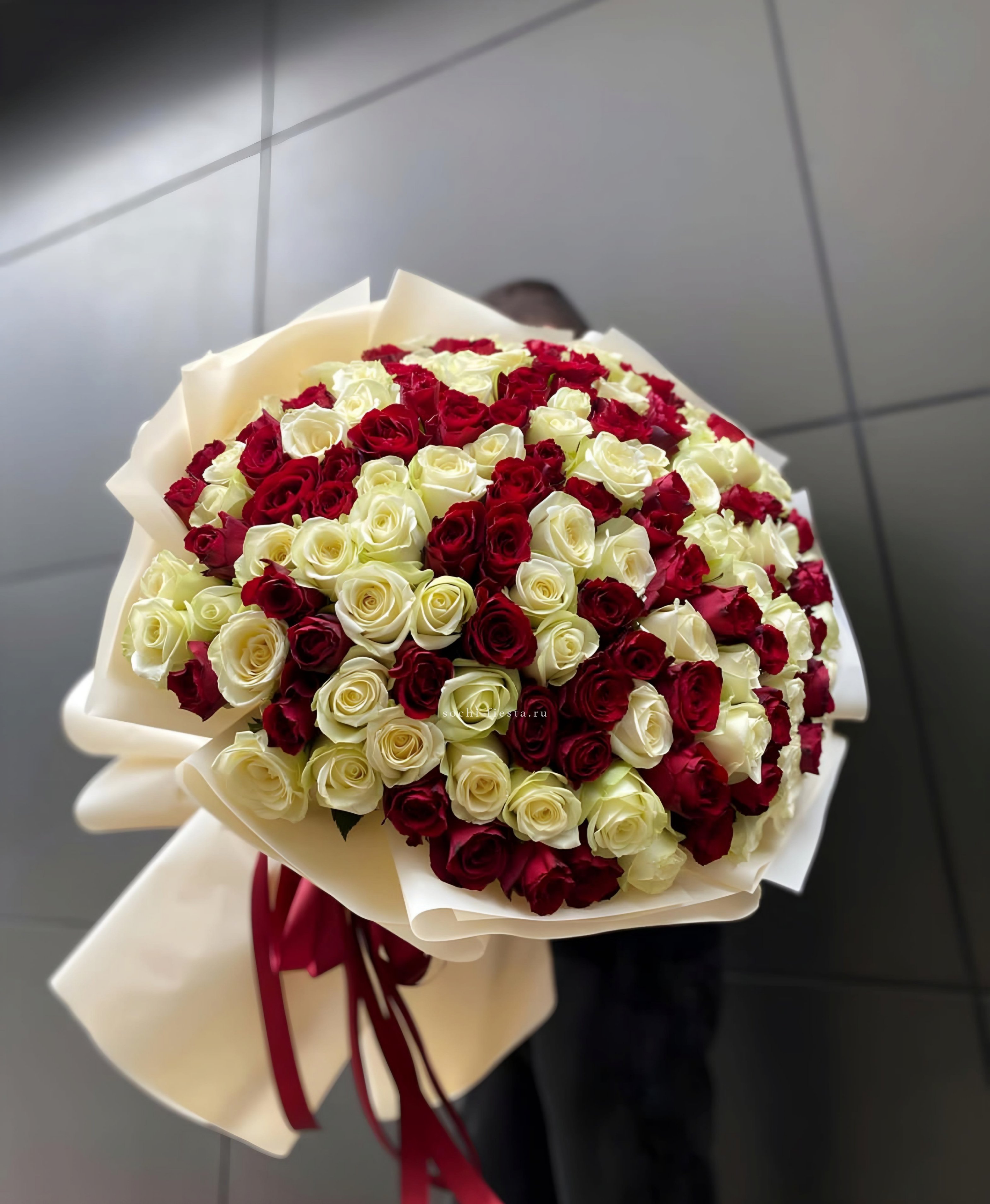 Сто одна белая роза собрана в впечатляющую охапку. Монохромная гамма и повторяющийся ритм бутонов создают мощное визуальное присутствие. Такой объём заполняет пространство и приковывает внимание.