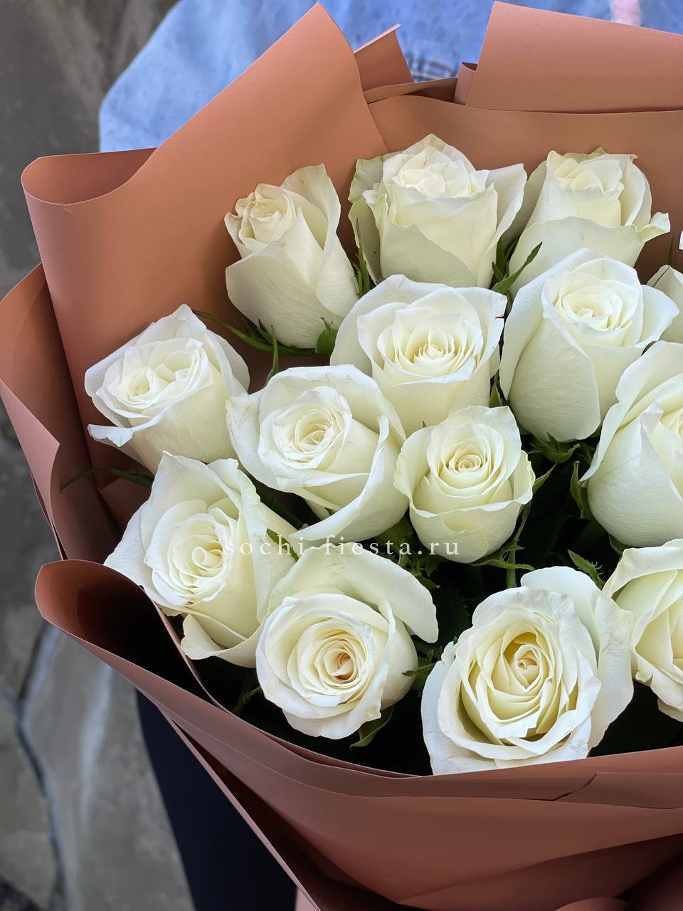 Пятнадцать белых роз в упаковке кофейного оттенка создают спокойное сочетание света и теплой глубины. Лаконичная форма букета удобна для вручения и дальнейшего размещения.