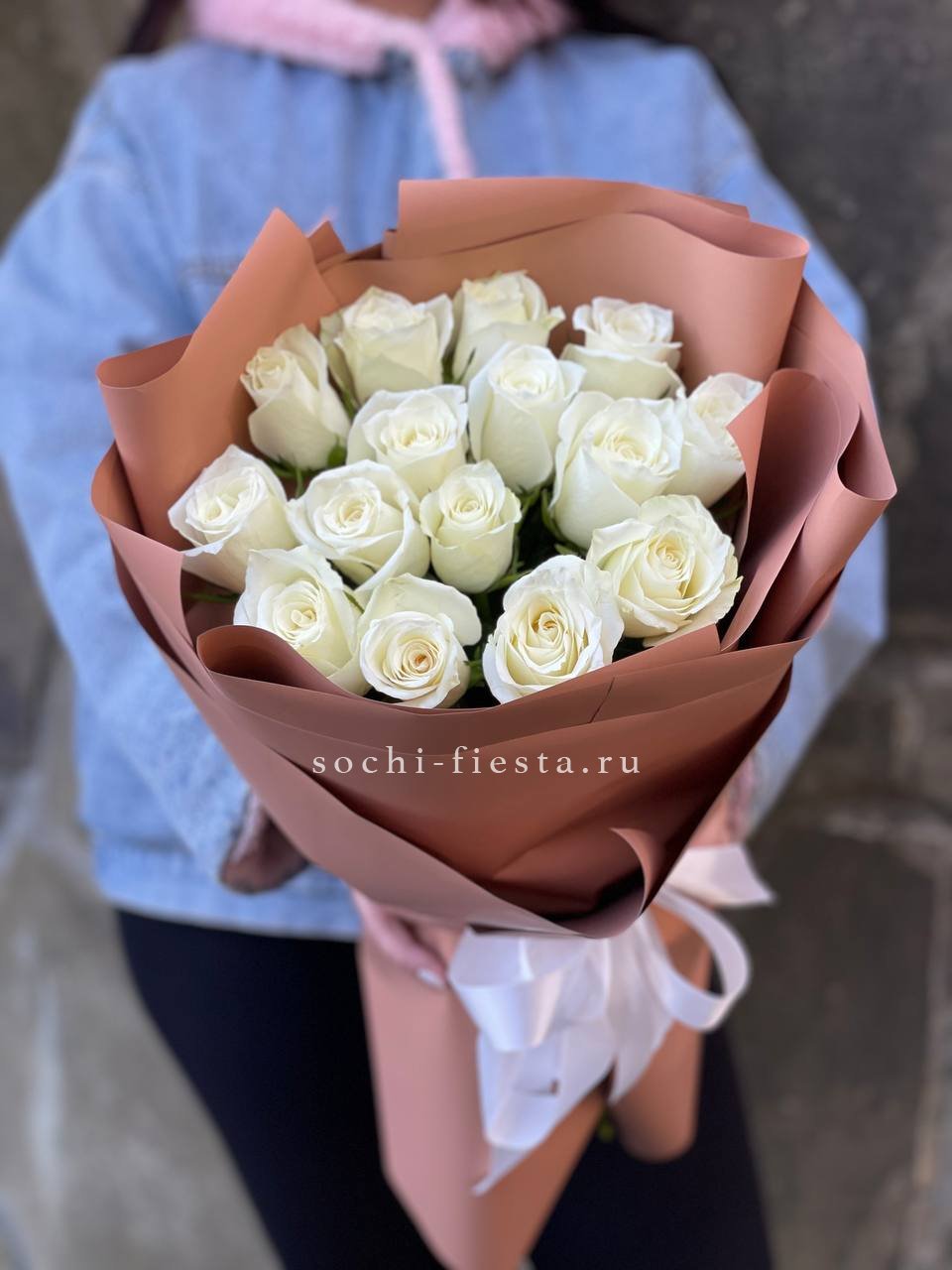 15 белых роз, лента, кофейная корейская пленка.