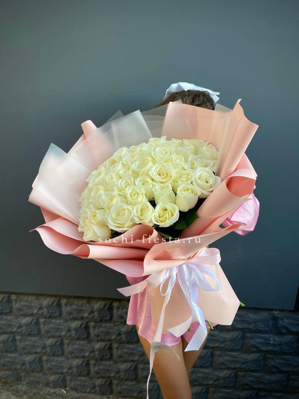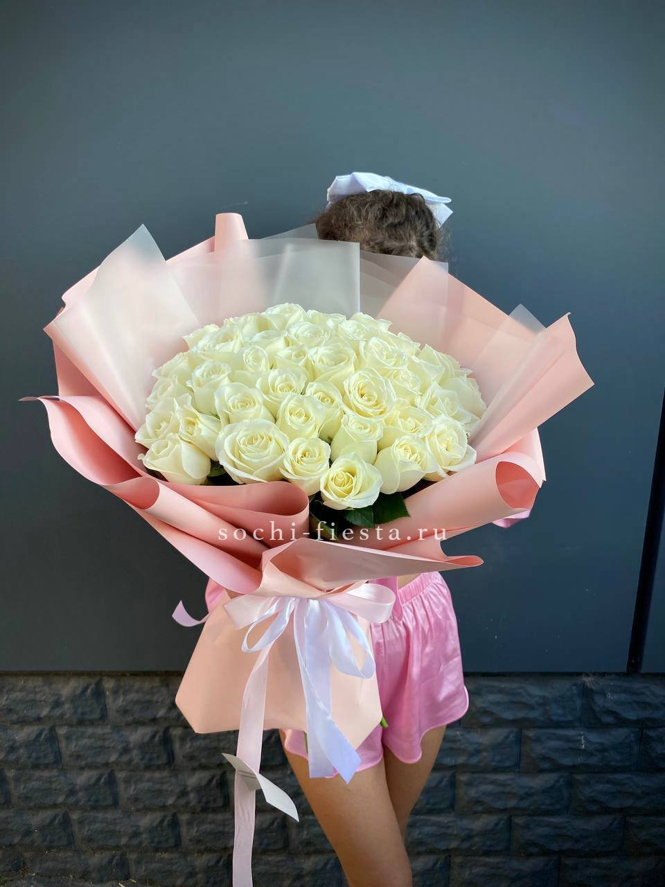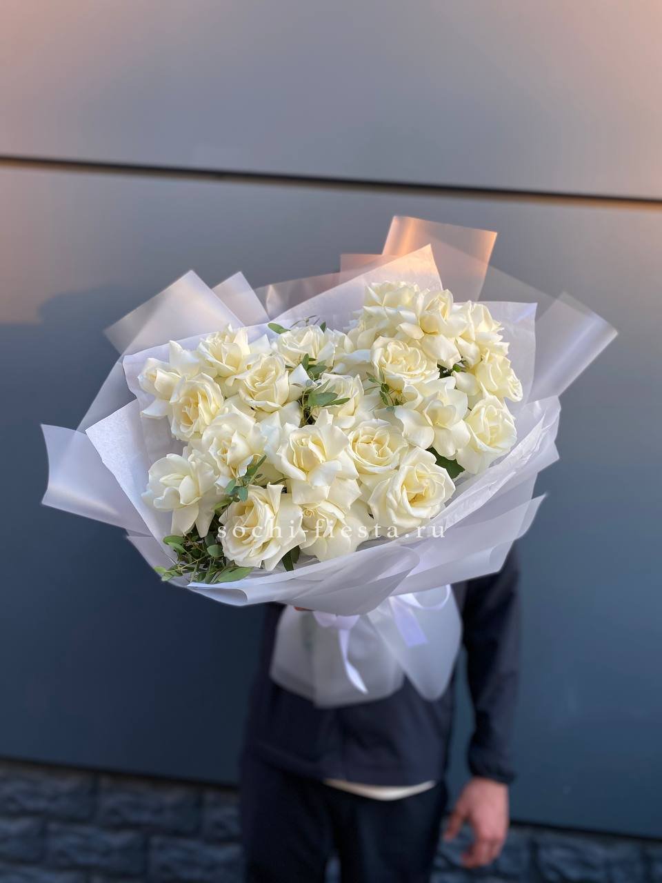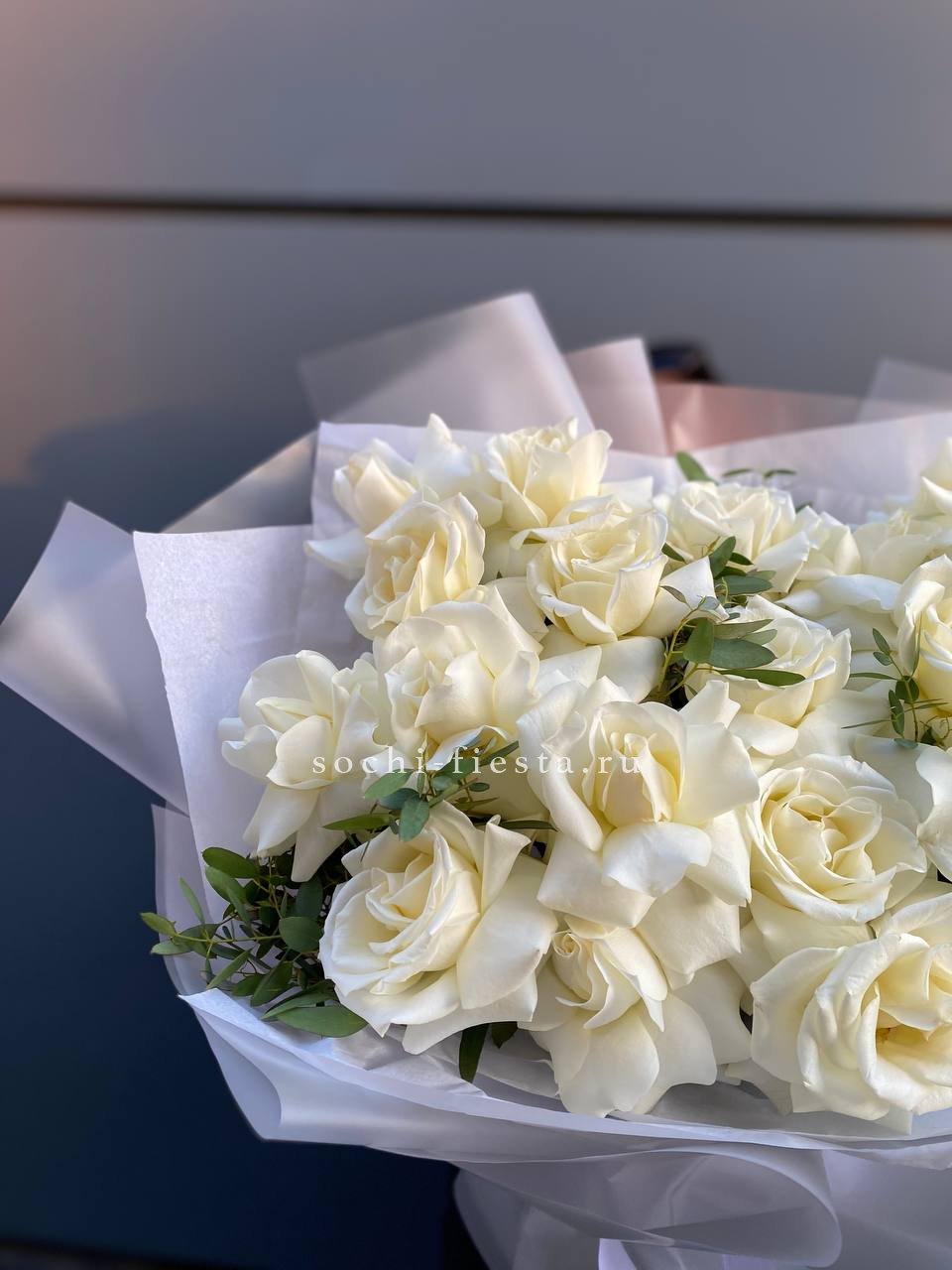 9 белых роз, декоративная зелень, дизайнерская упаковка.