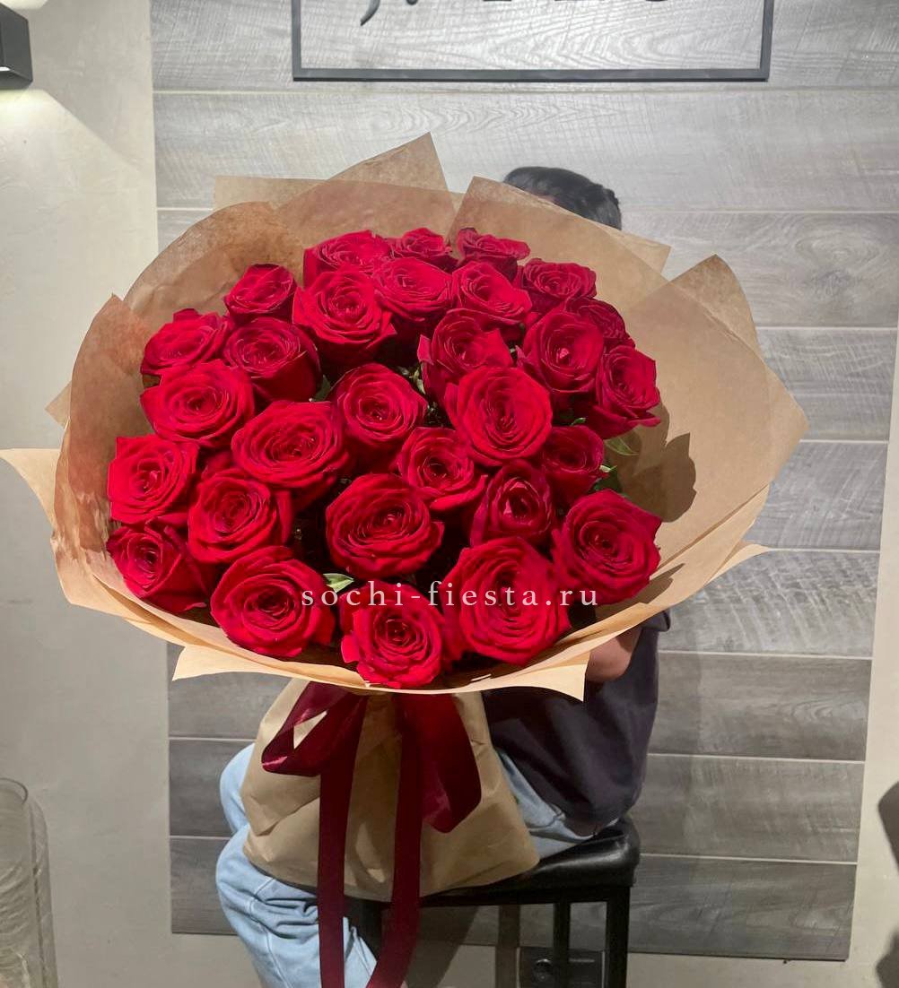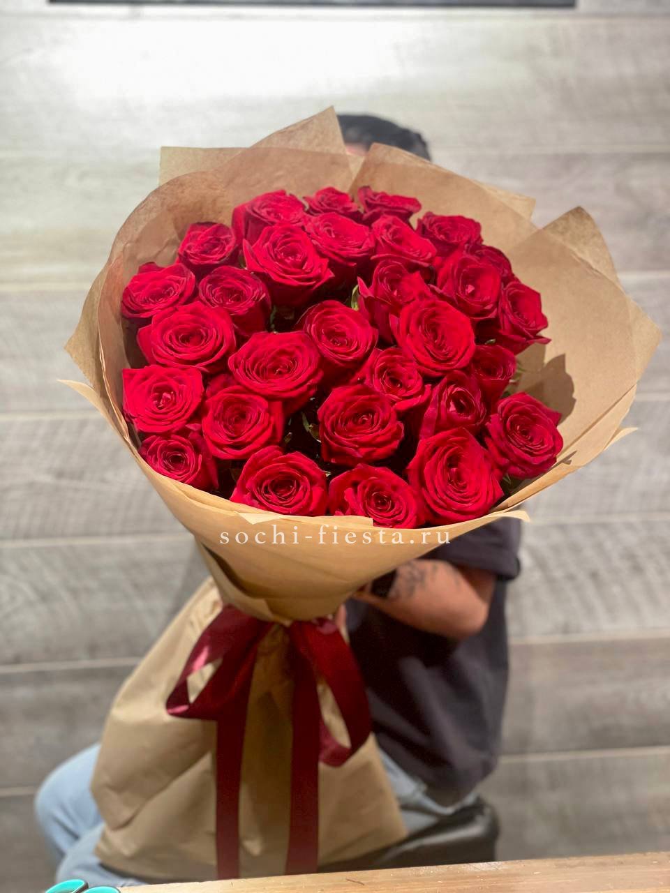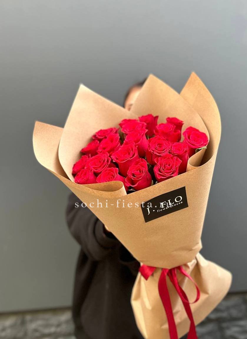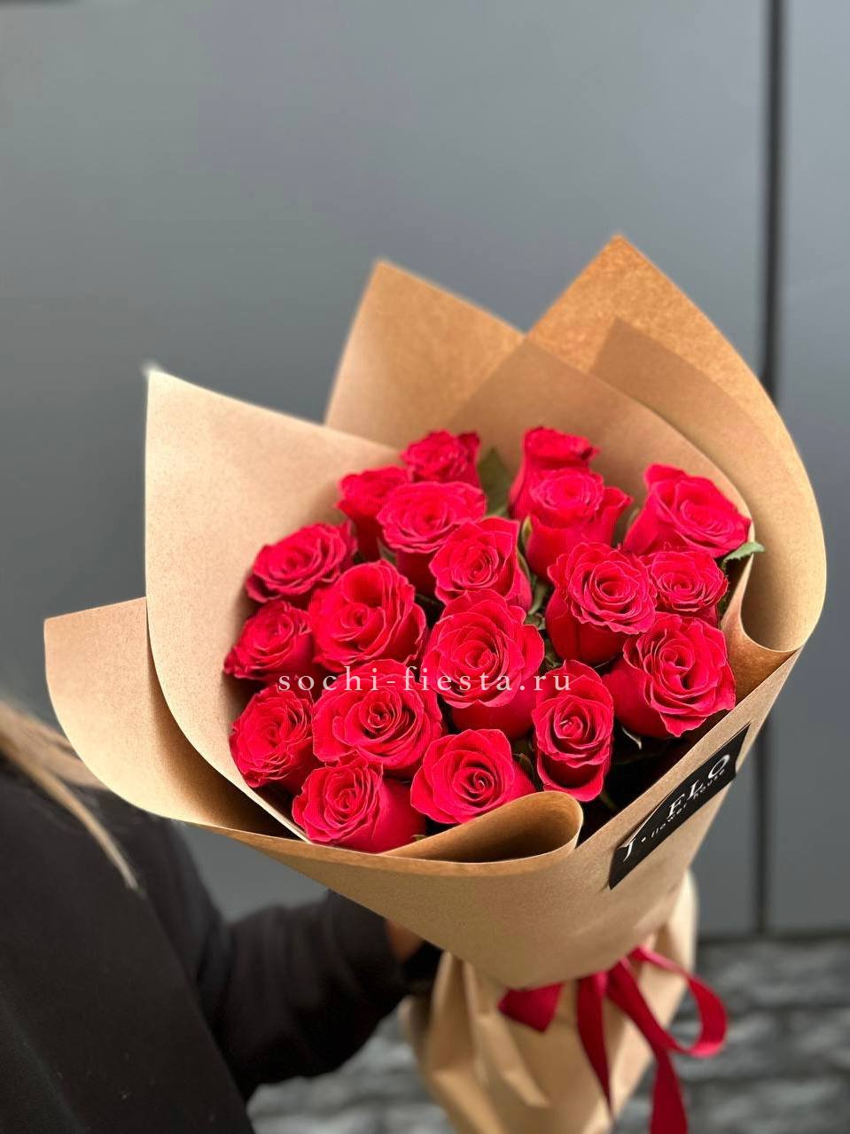 Красные розы в количестве девятнадцати стеблей, оформленные в матовую крафт-бумагу. Минималистичная обертка не отвлекает от насыщенного цвета и упругих бутонов. Простое решение с четким характером.