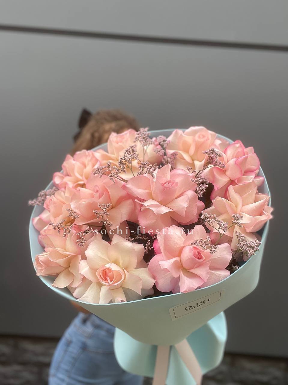 Французские розы с лимониумом образуют плотный силуэт с живым ритмом. Вертикальные линии соцветий задают направление, а бутоны удерживают форму без лишних акцентов.