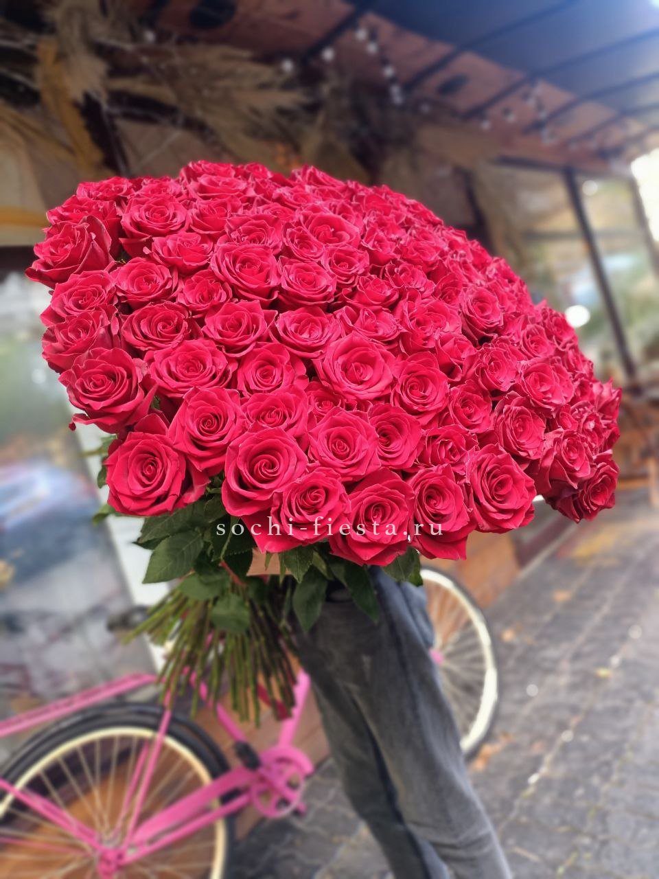 Двадцать пять красных роз собраны в плотный монохромный букет. Глубокий алый оттенок создаёт насыщенное цветовое пятно, которое притягивает внимание и наполняет пространство энергией.