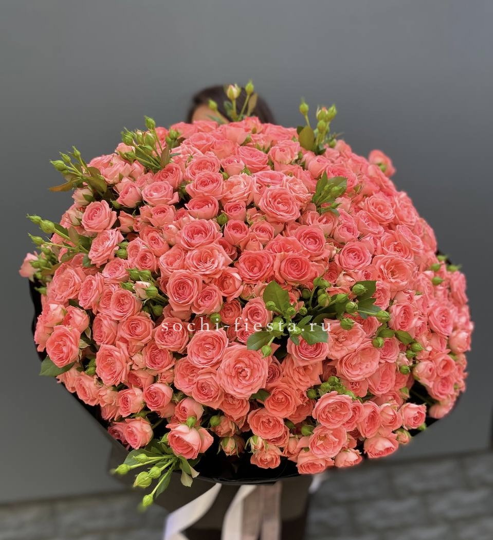 Сто одна кустовая роза Барбадос создаёт впечатляющий объём и визуальную мощь. Множество бутонов формируют плотную структуру с выразительным силуэтом. Композиция наполняет пространство и приковывает взгляд.