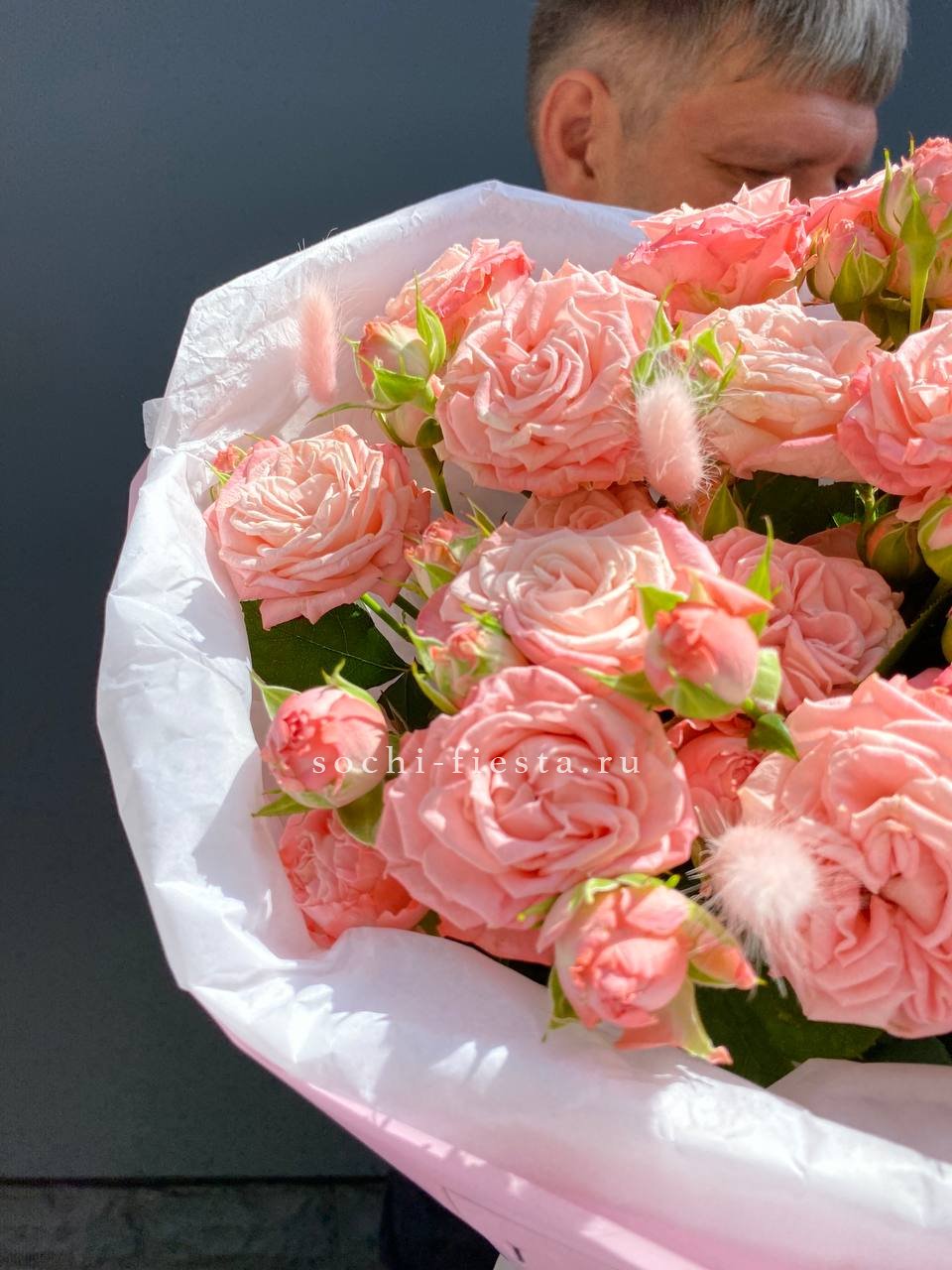 кремовые кустовые розы, лагурус, лента, дизайнерская пленка комбинированная.