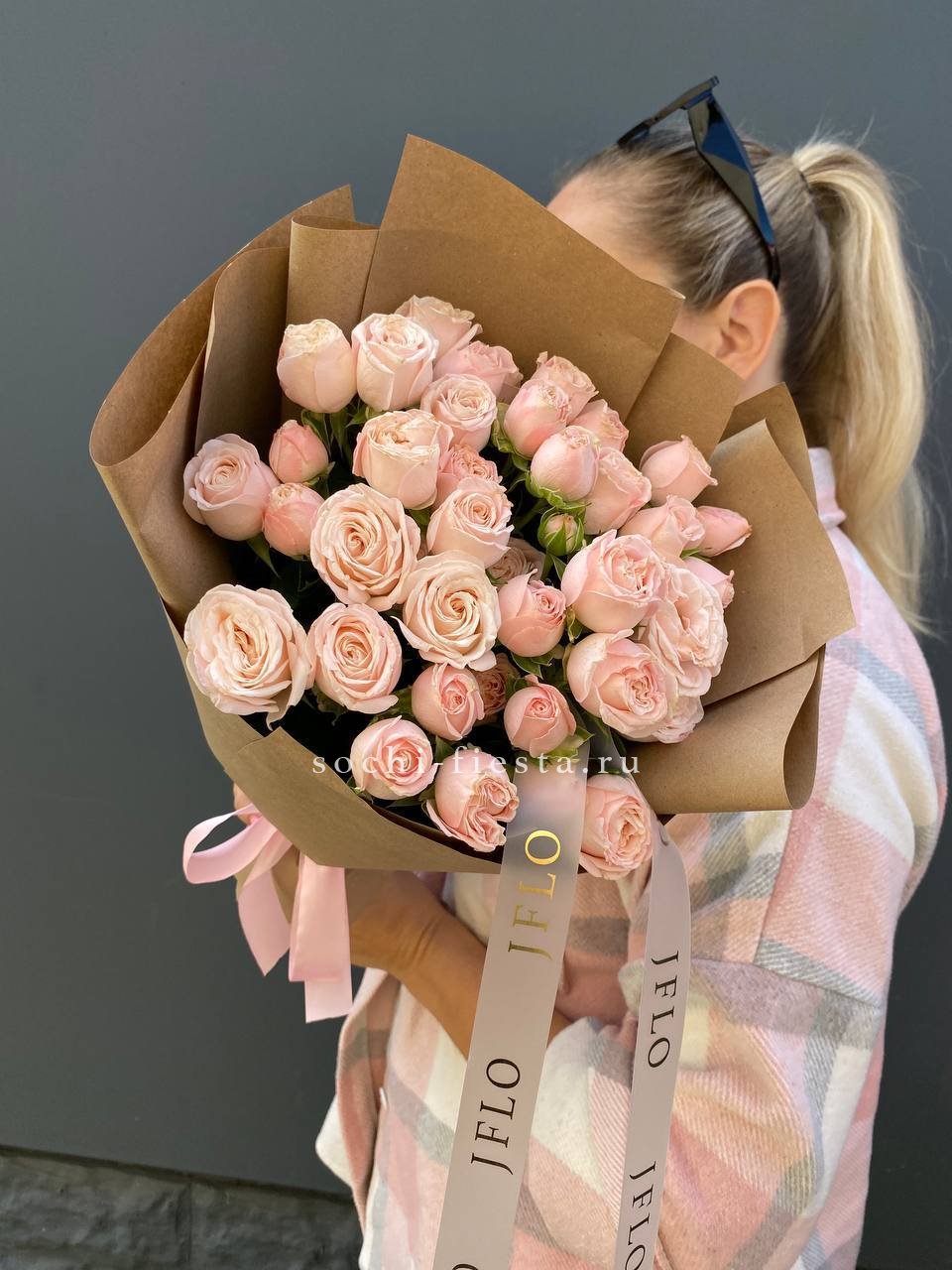 Кремовые кустовые розы сорта Мадам Бомбастик с пушистым лагурусом в дизайнерской упаковке. Многослойные бутоны создают воздушный силуэт. Мягкая пастельная гамма и природная фактура трав формируют спокойный образ.