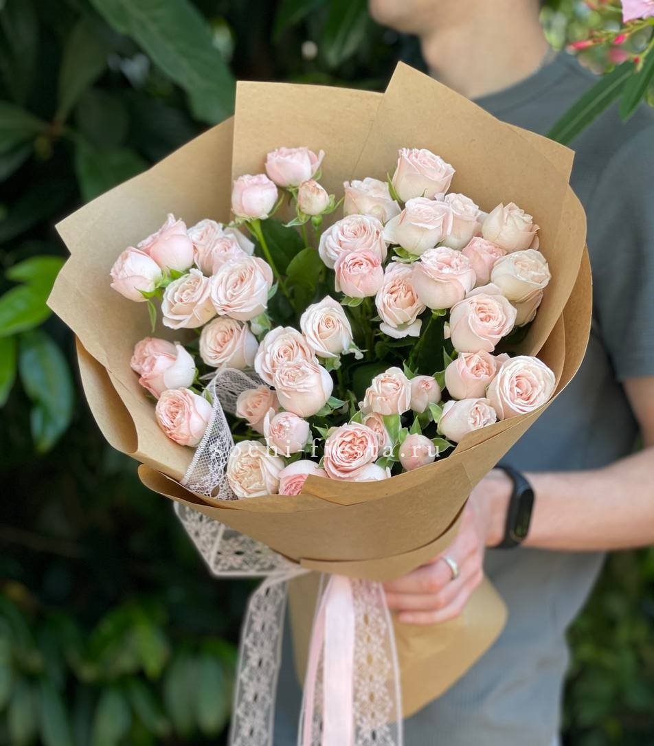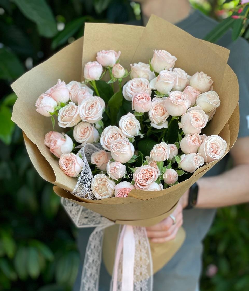 кустовые розы, лента, дизайнерская пленка.