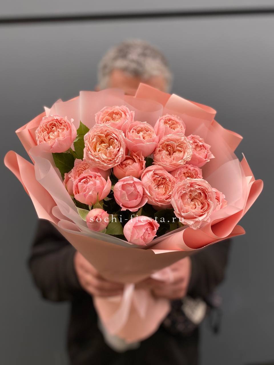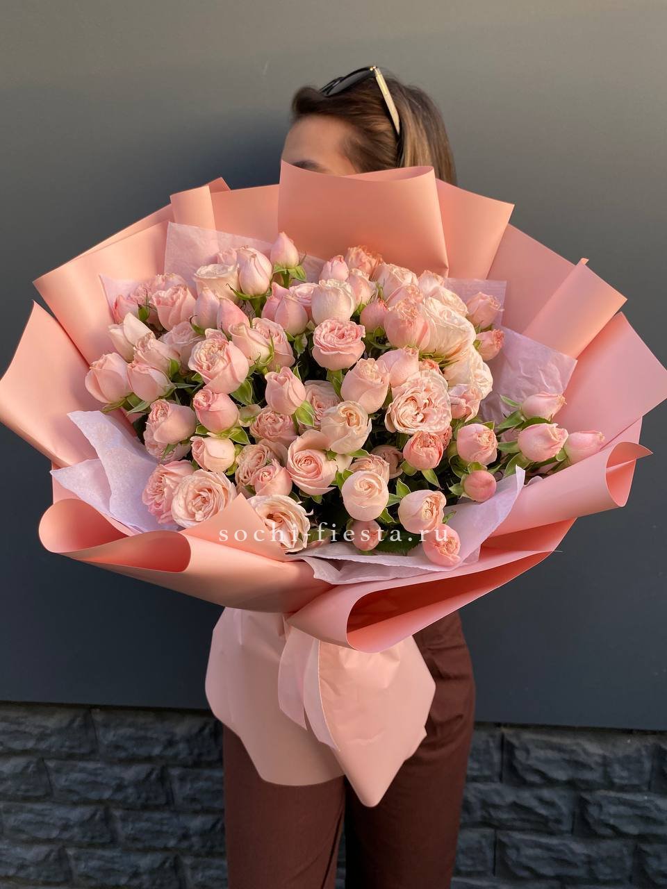 Пять веток кустовой розы Джульетта в лаконичной сборке. Каждая ветвь раскрывается несколькими бутонами теплого персикового оттенка. Компактный формат для быстрого знака внимания.