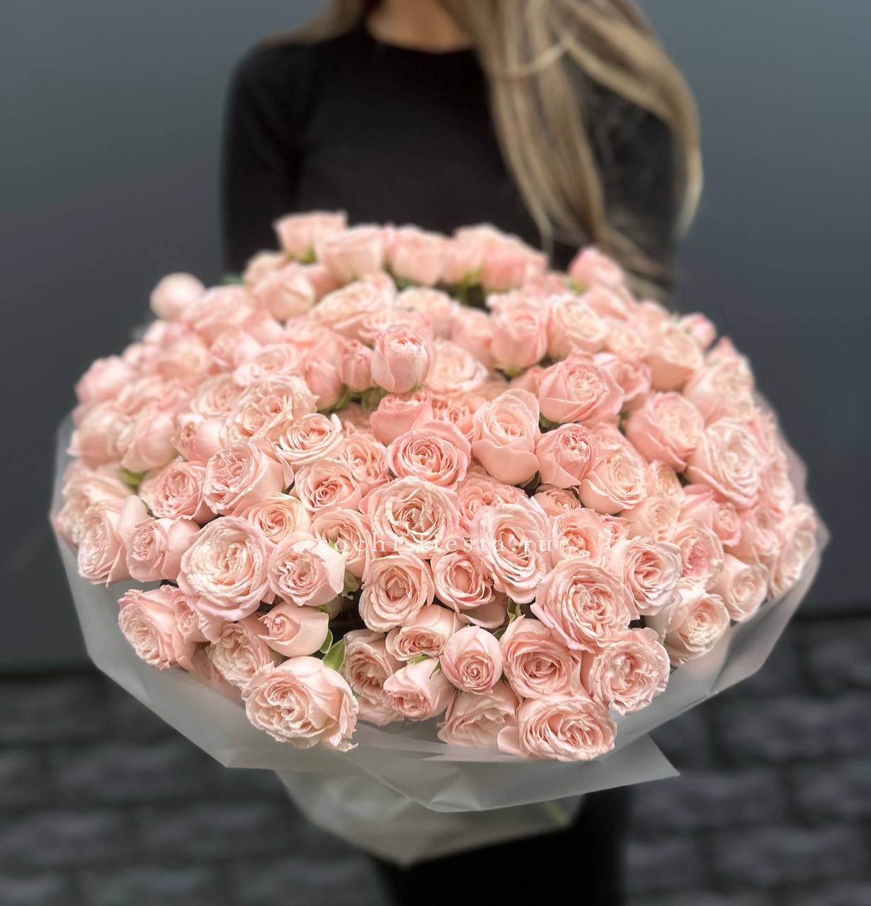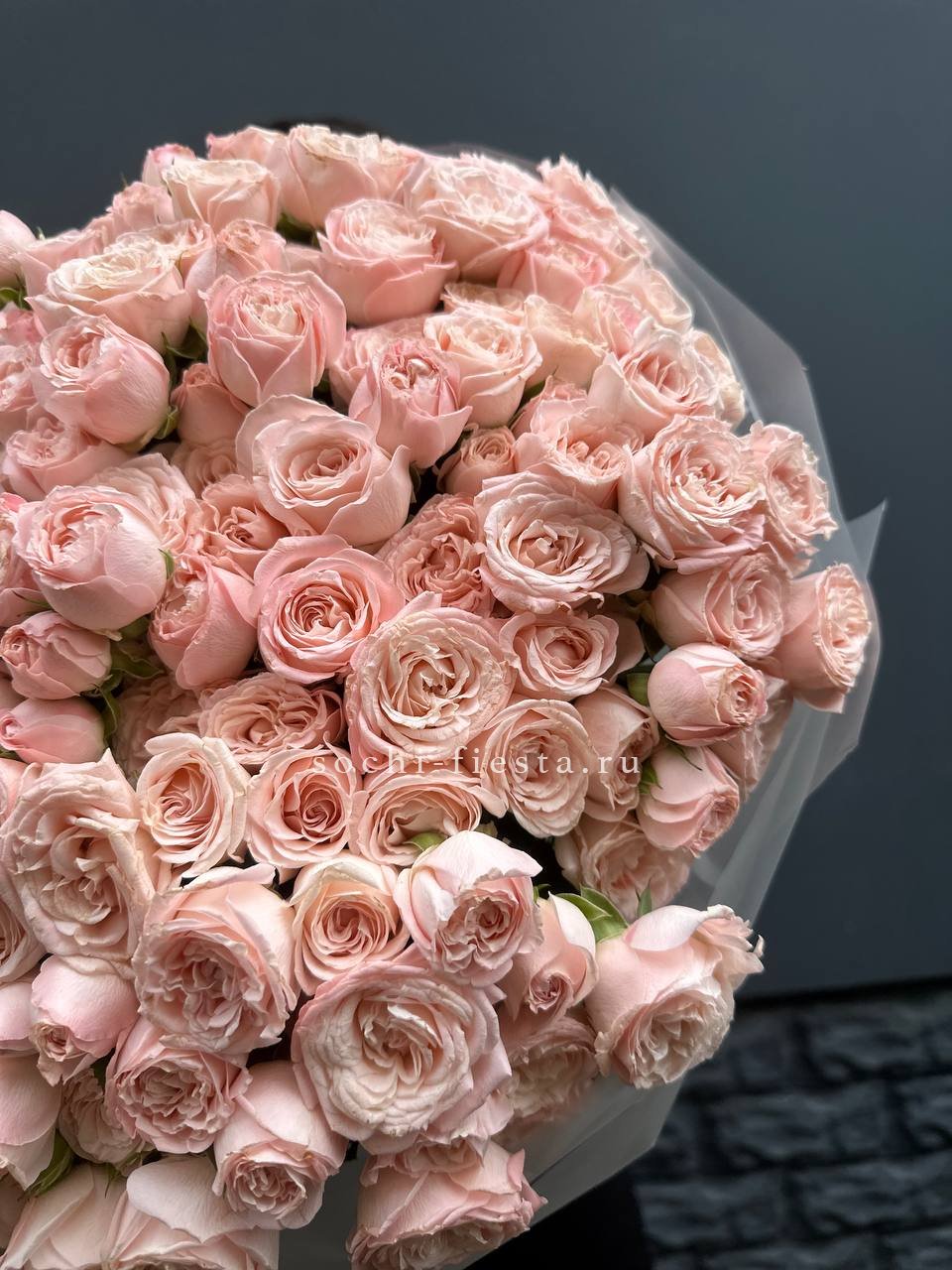 пионовидные розы сорта Бомбастик - 201 шт., дизайнерское оформление По желанию заказчика, композицию можно оформить в корзину.