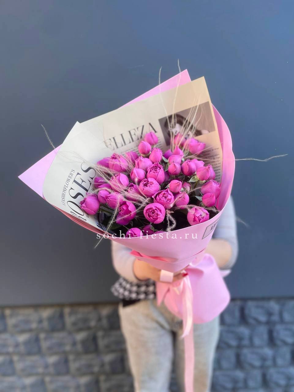 Минимальный состав: 35 пионовидных кустовых роз Мисти бабблс, лента, авторское оформление.