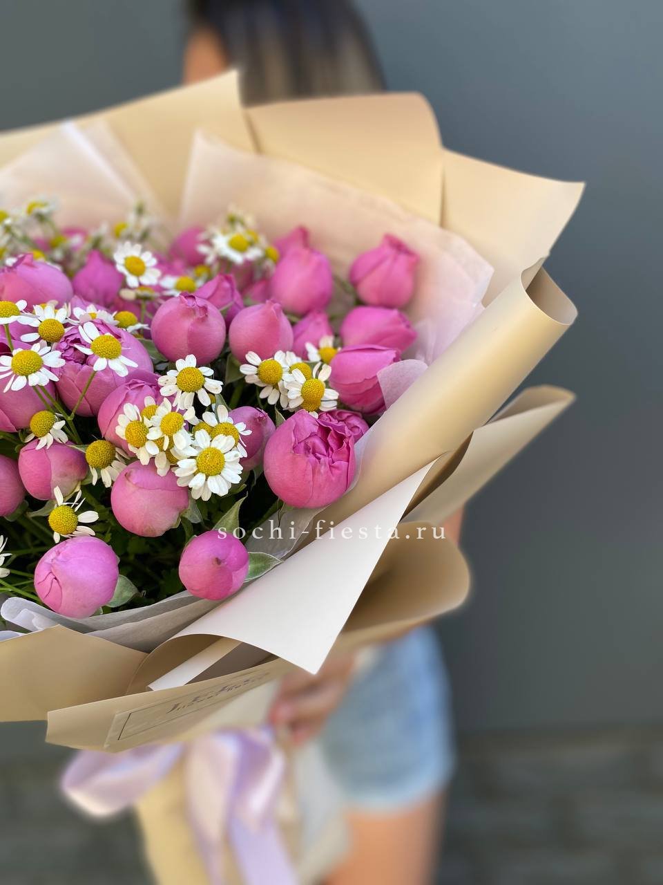 кустовые розы мисти бабблс, ромашки, лента, упаковка.