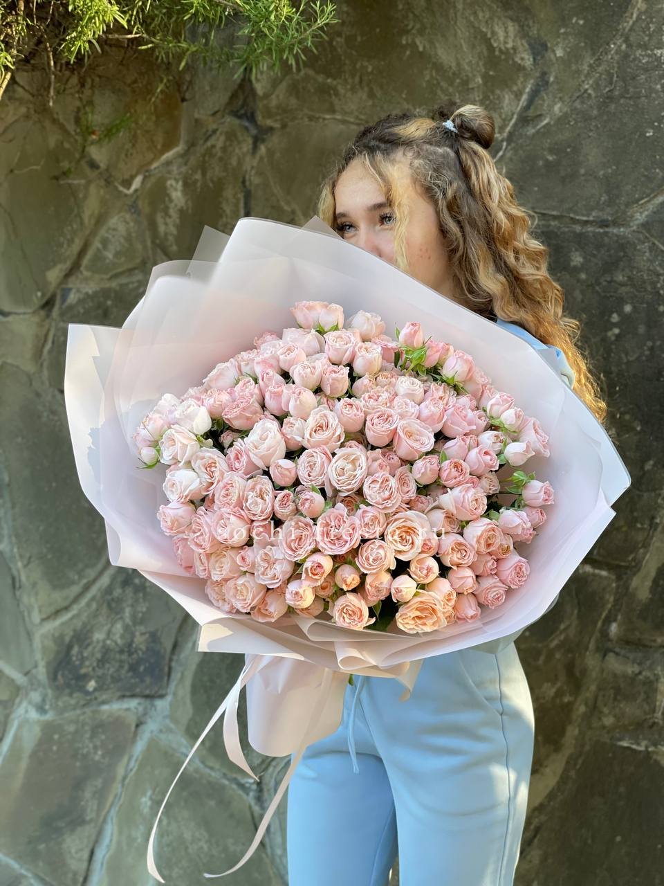 Пятнадцать кустовых роз собраны в плотную округлую форму. Мелкие бутоны создают воздушную текстуру и мягкий объём в пространстве.