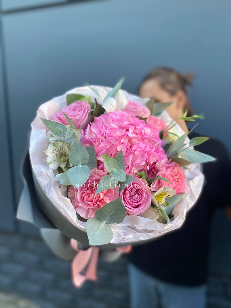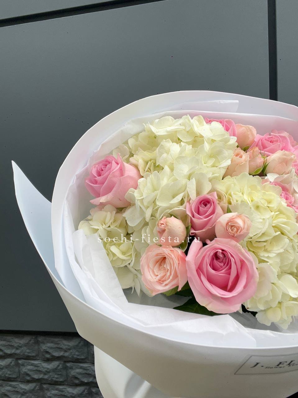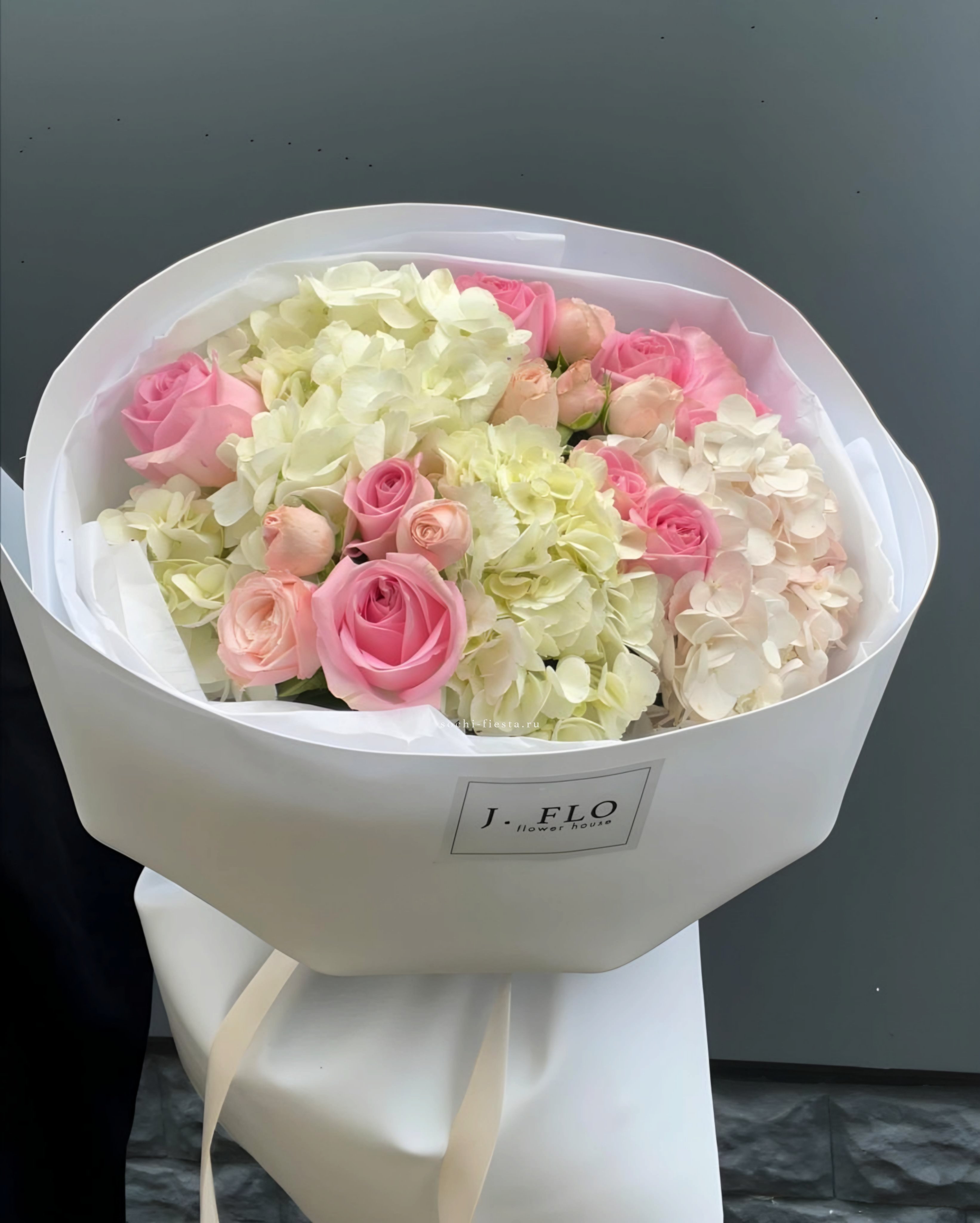 Белые розы и шары гортензии заполняют пространство плотно, но без тяжести. Озатамус вносит лёгкую текстуру, а эвкалипт завершает силуэт спокойной зеленью.