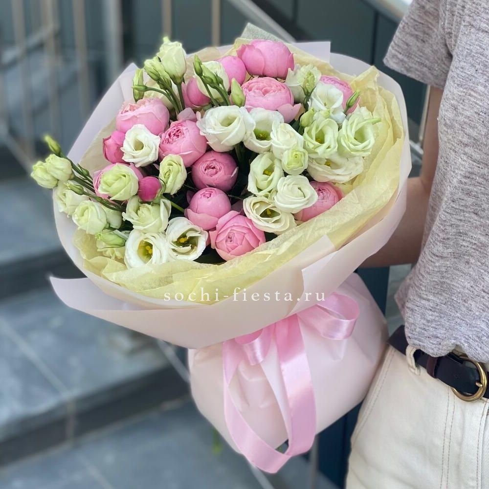 диантус, эустома, эвкалипт,  лента, дизайнерская пленка.