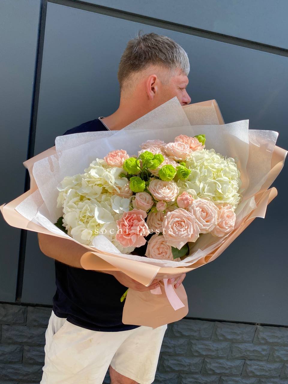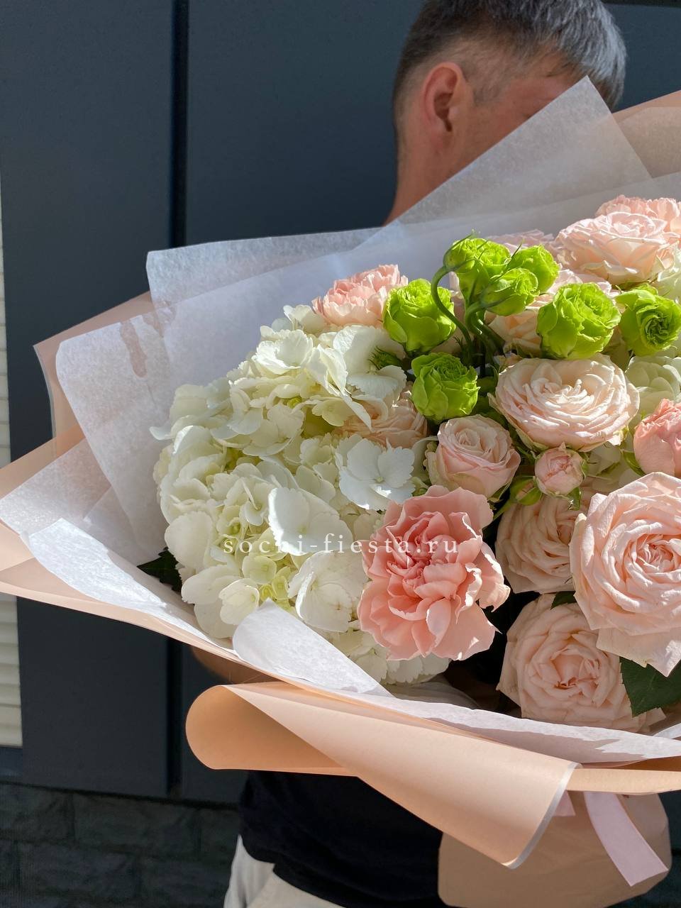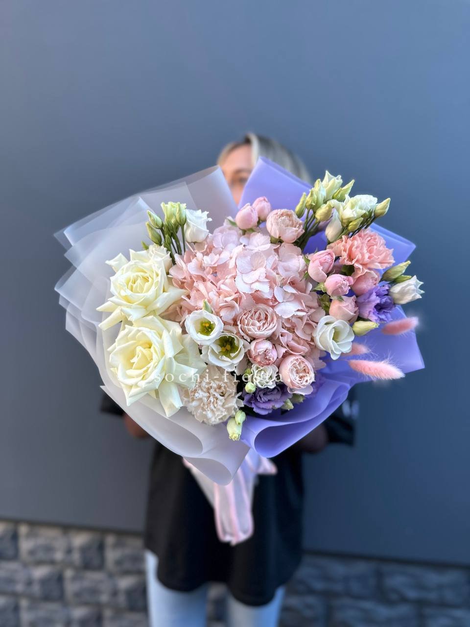 Крупные соцветия гортензии задают основной объем, а эустома и диантус разбивают плотность воздушными бутонами. Мисти баблс и озотамус рассыпаются между цветами, добавляя движение и легкость всей композиции.