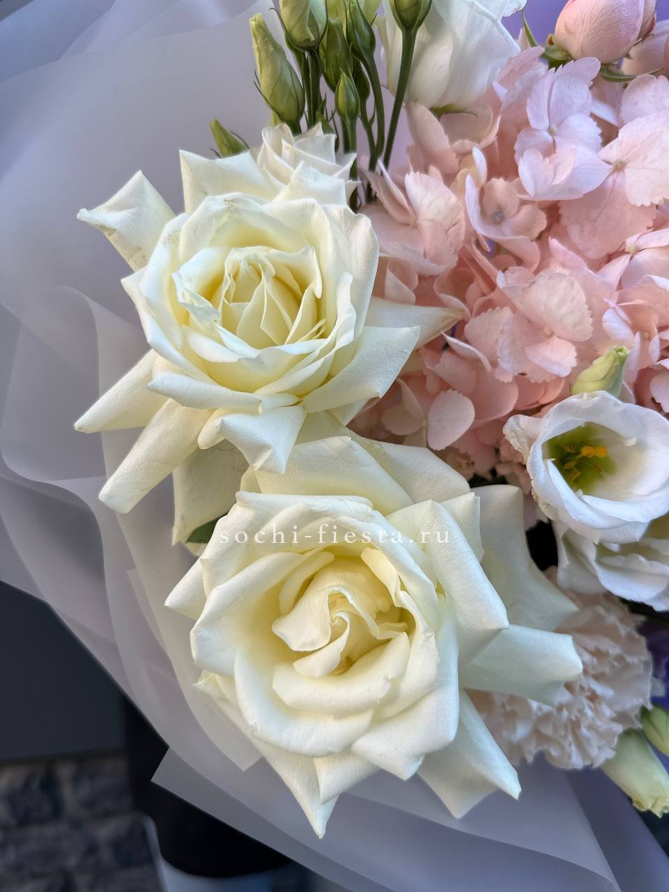 гортензия, эустома, диантус, мисти баблс, озотамус в нежном оформлении.
