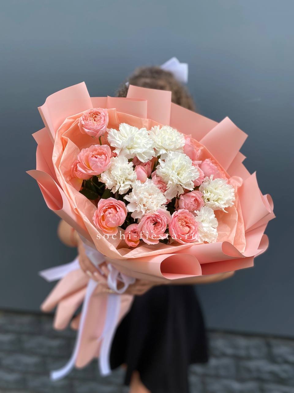 Пудровые кустовые розы Джульетта собраны в плотный круг вместе с яркими диантусами. Форма букета держится за счёт аккуратной обёртки и ленты. Композиция выглядит собранно и готова к вручению без дополнительной упаковки.