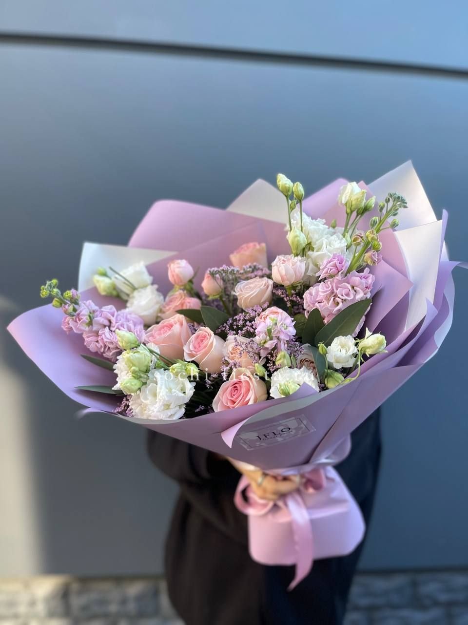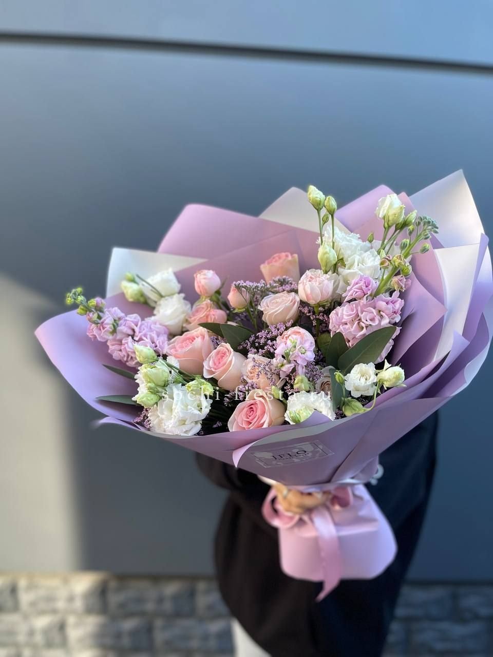Сирень обвивает пышные бутоны пионовидных роз и задает мягкий лиловый ритм всей композиции. Букет дышит весной и заполняет пространство ароматом. Форма свободная, но собранная.