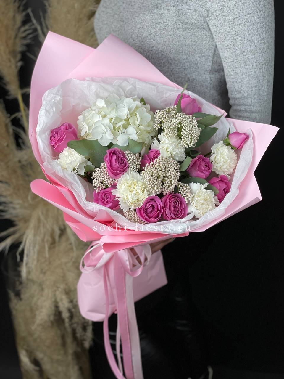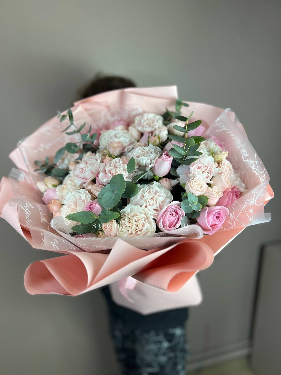 диантус, розы, бомбастик, эвкалипт, упаковка.