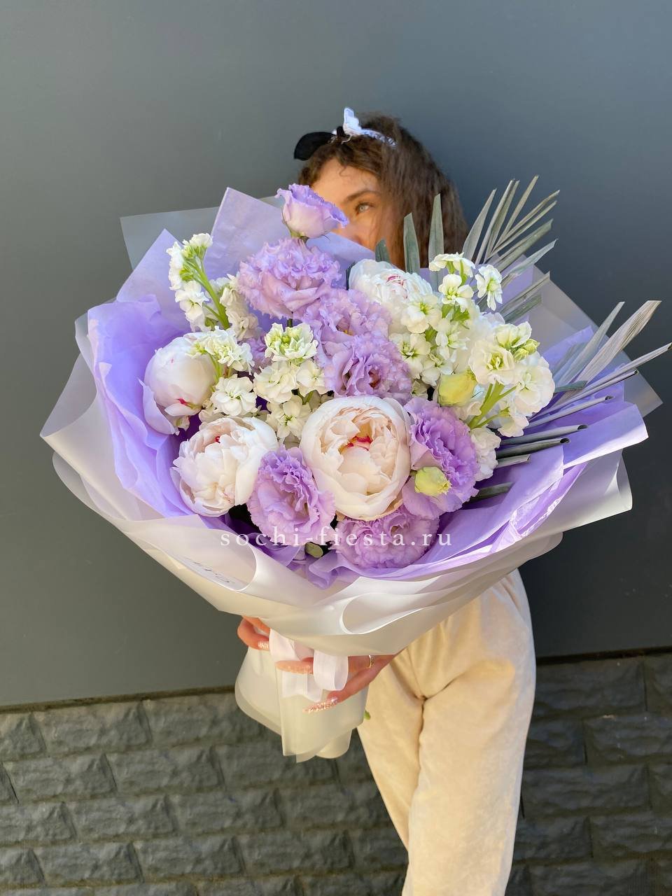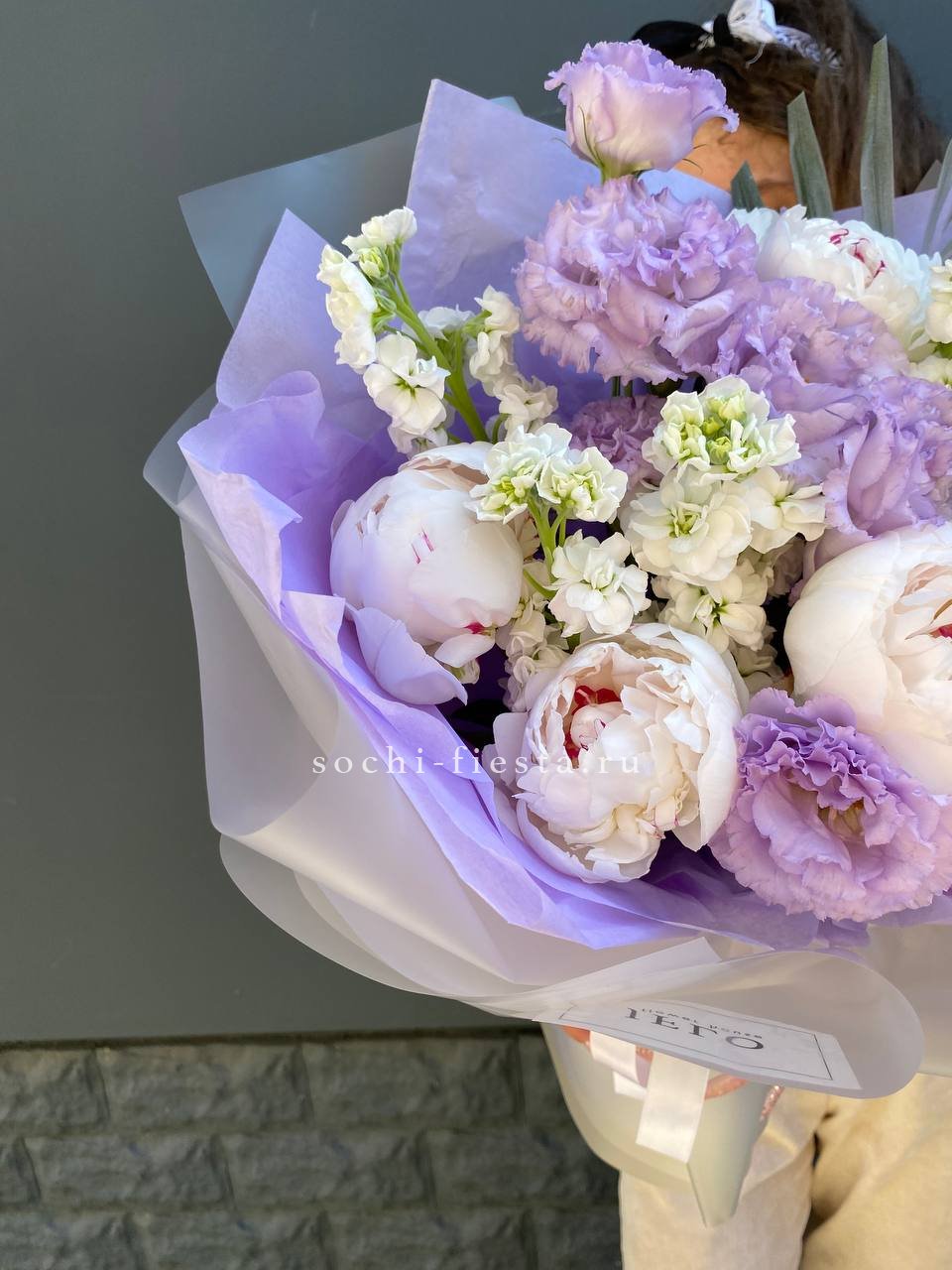 Пионы и эустома собраны в свободную форму где каждый бутон раскрывается в своём ритме. Маттиола и чико дополняют букет мягкими линиями и природной непринужденностью.