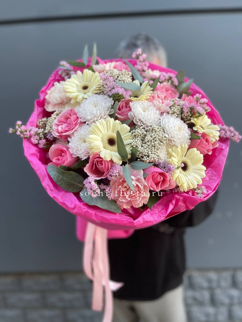 Пышный микс из гербер, хризантем и роз в обрамлении диантуса и статицы. Букет собран плотно, с яркими акцентами по всей форме. Озатамус и эвкалипт добавляют глубину и завершенность композиции.