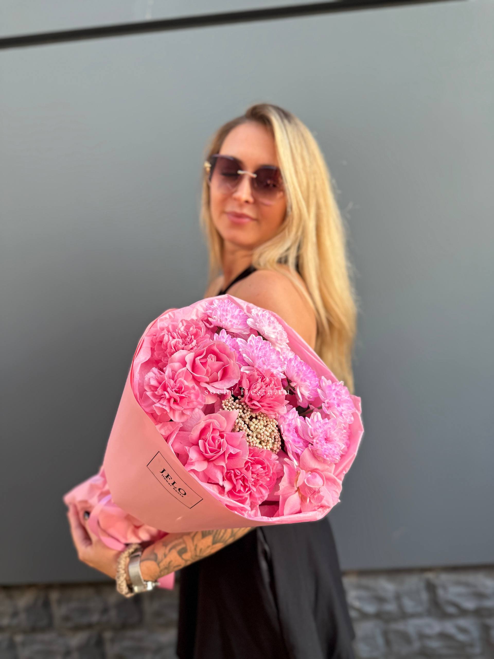 Lucrecia собрана из пионовидных и классических роз с добавлением пушистых кустовых хризантем. Букет легко впишется в современный интерьер и поддержит спокойную эстетику пространства.