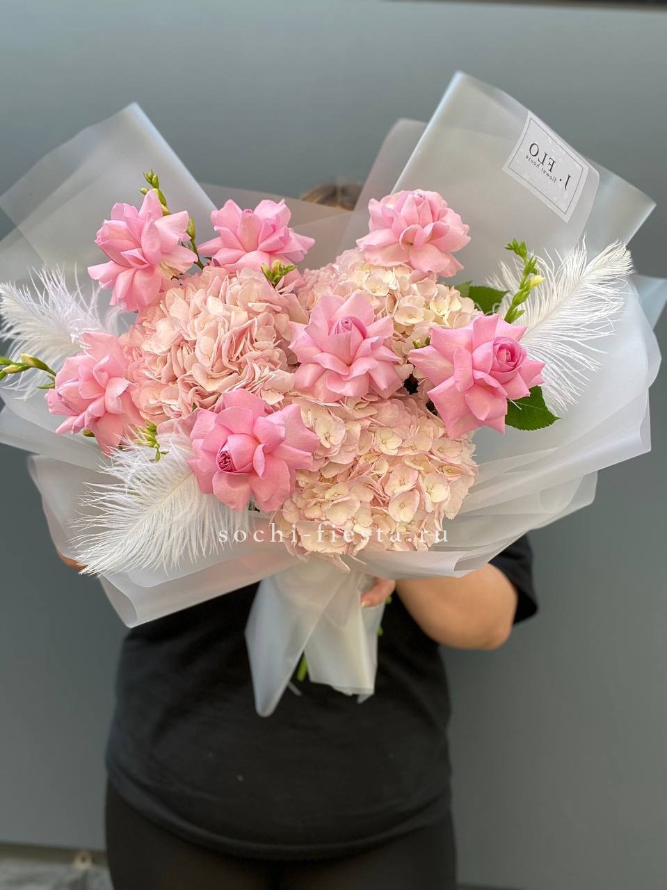 Насыщенные оттенки гербер и роз переплетаются с воздушными соцветиями гортензии. Хлопковые коробочки и диантус создают многослойную текстуру букета.