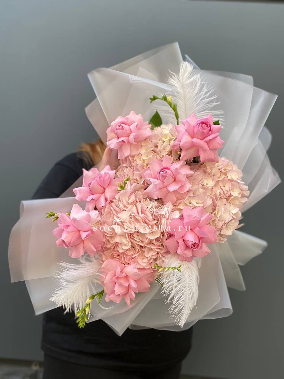 гербера, роза, хлопок, гортензия, диантус, эвкалипт, упаковка.