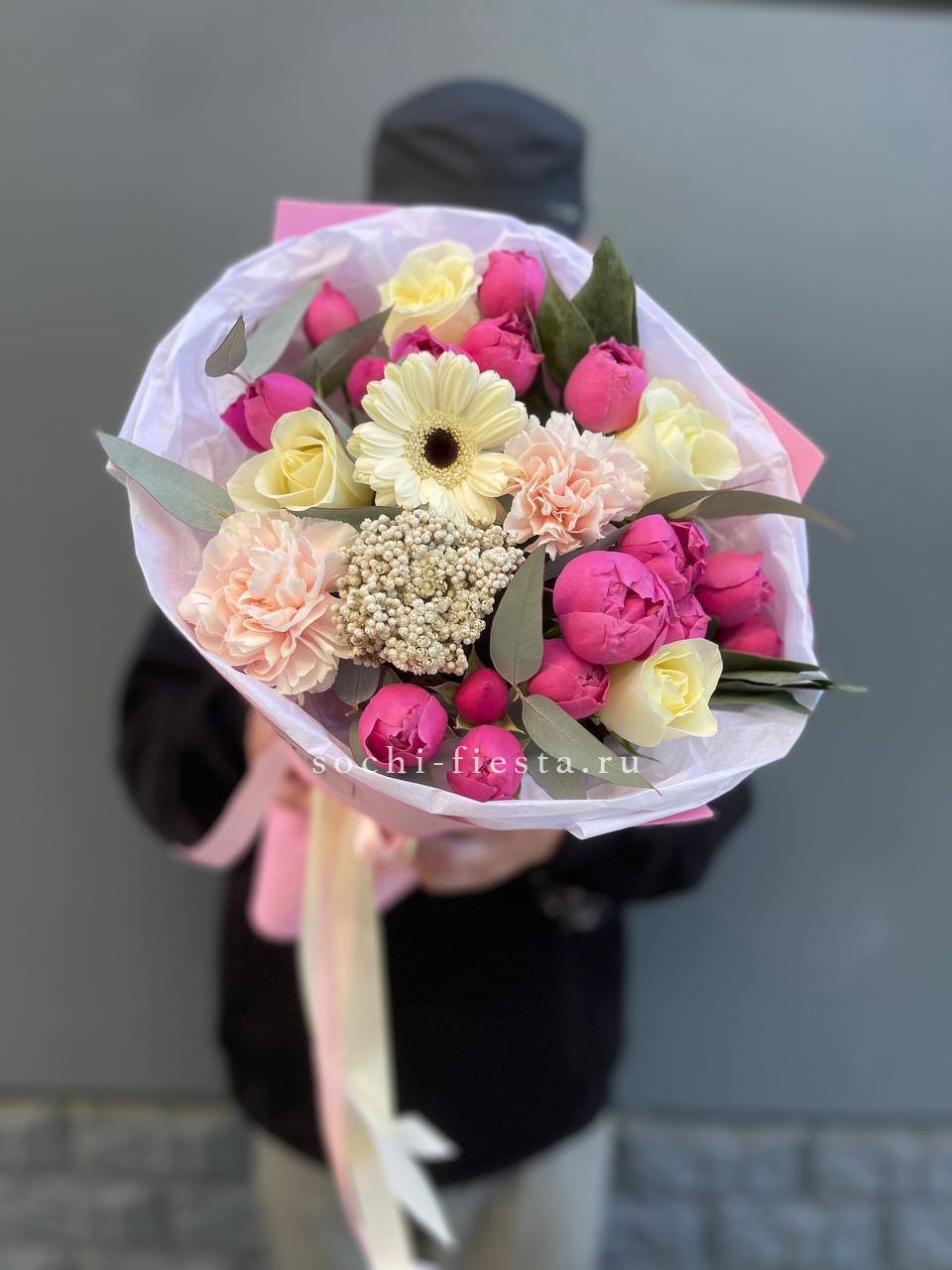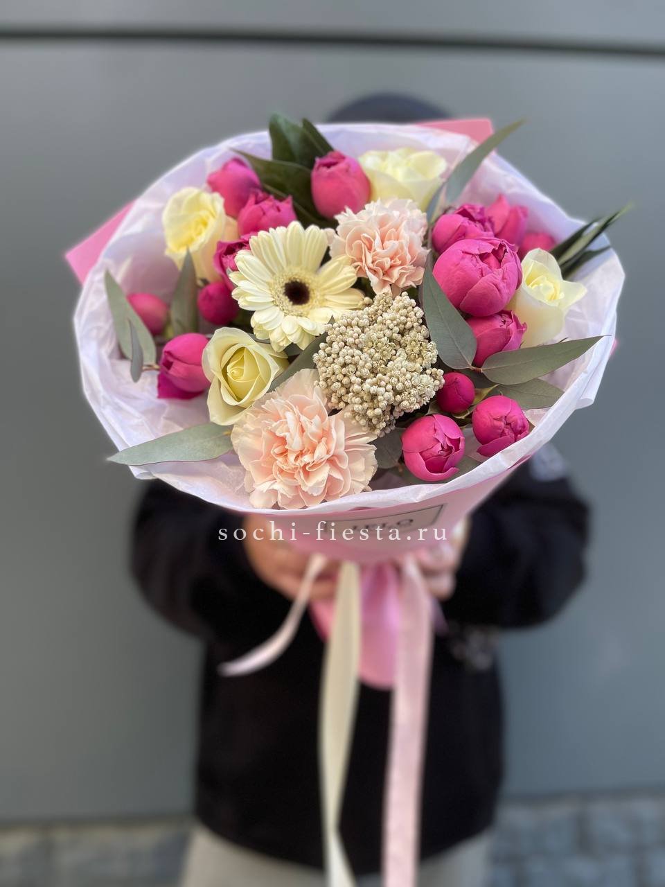 Мягкие пионовидные формы переплетаются с классическими розовыми бутонами в плотной округлой композиции. Эвкалипт освежает палитру и придаёт букету завершённость.