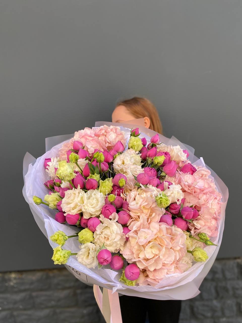 гортензия, пионовидная кустовая роза,  розовая роза, хризантема,  эвкалипт, лента, дизайнерская пленка.