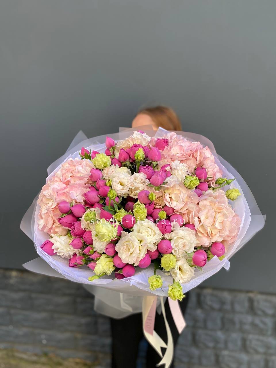 Гортензия формирует воздушную базу, сквозь которую проступают бутоны пионовидной кустовой розы и классических розовых соцветий. Хризантема добавляет графичности и удерживает форму без лишней массивности.