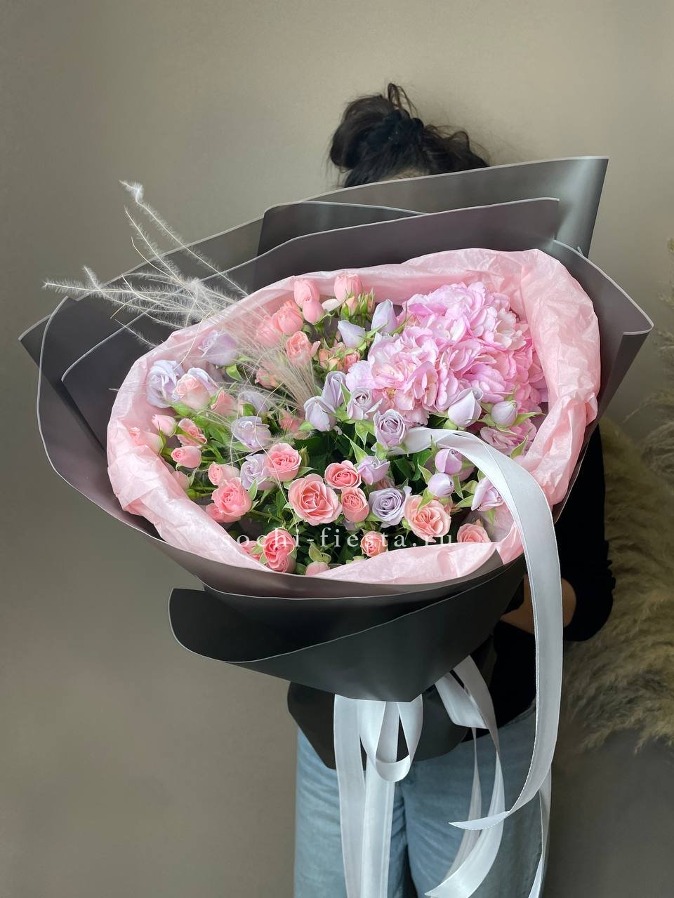 гортензия, кустовая роза, розовая роза, дельфиниум/маттиола/львиный зев, амарантус, эвкалипт или аналог, декор, корейская пленка, лента.