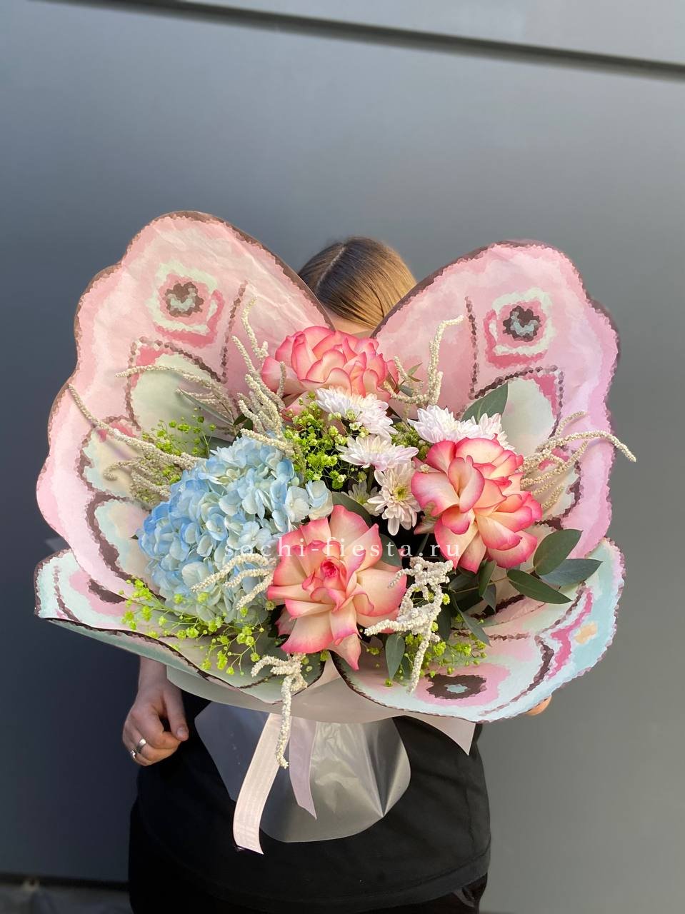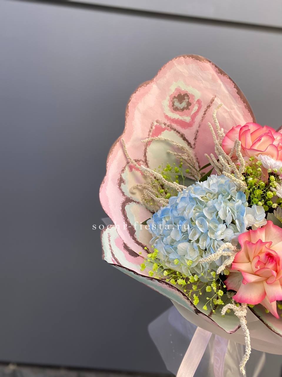 гортензия, роза одноголовая, бомбастик, декоративная зелень, эвкалипт, лента, дизайнерская упаковка.