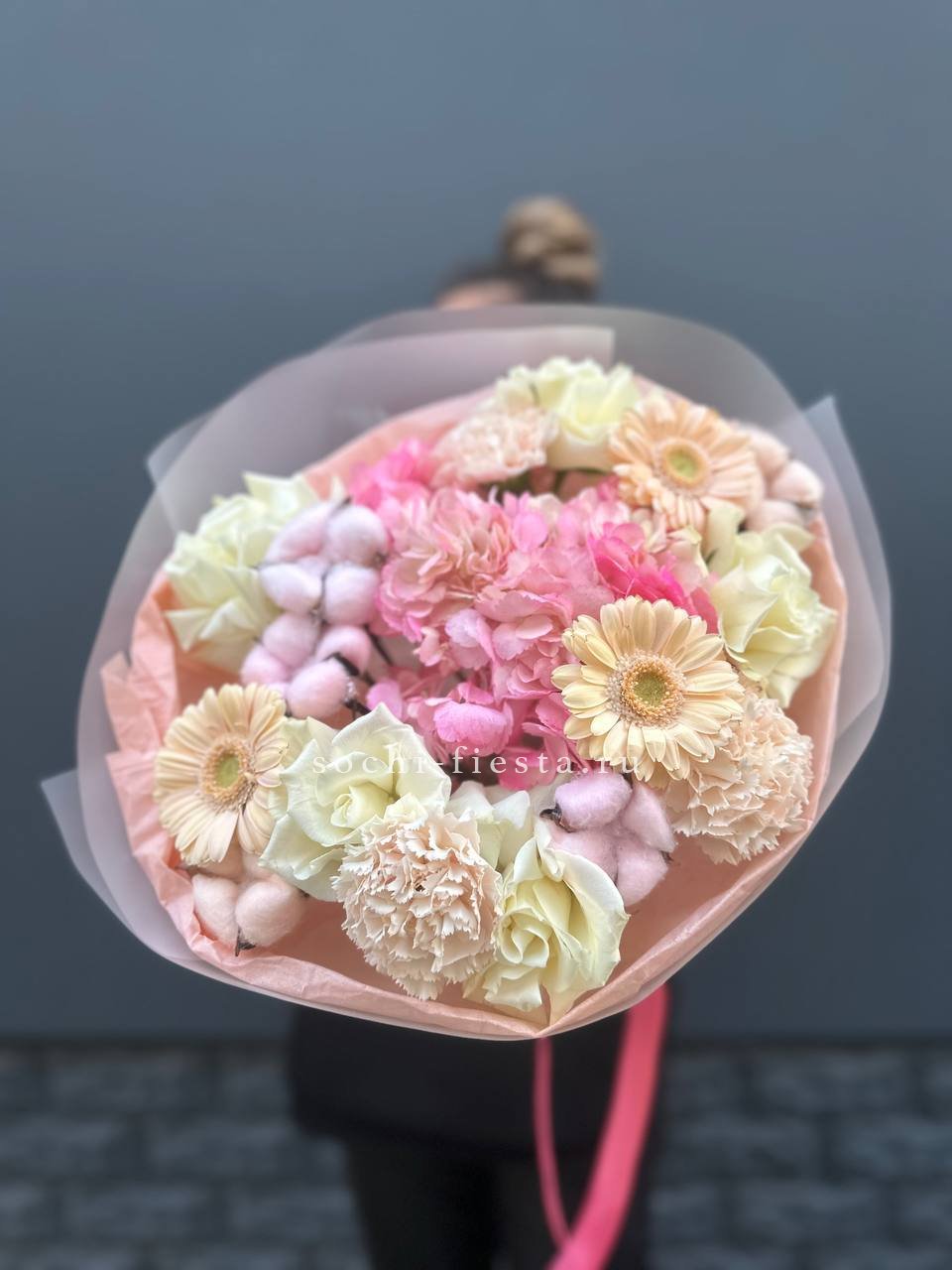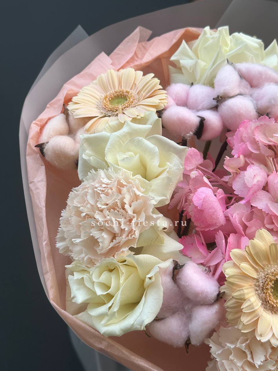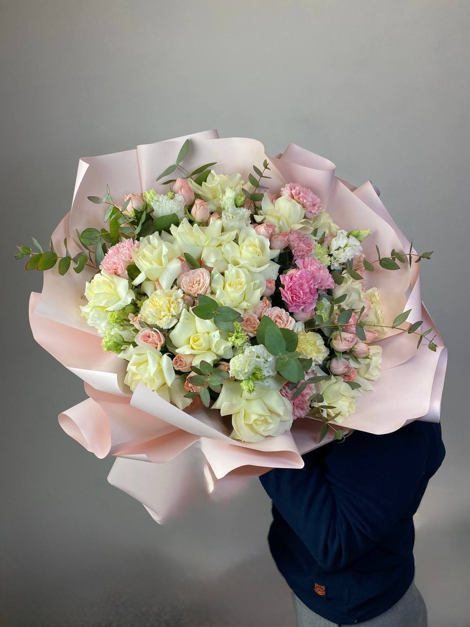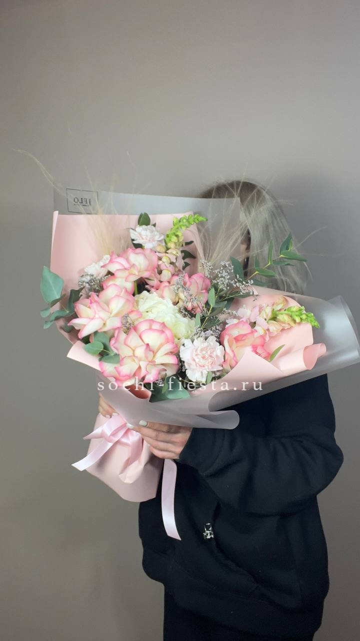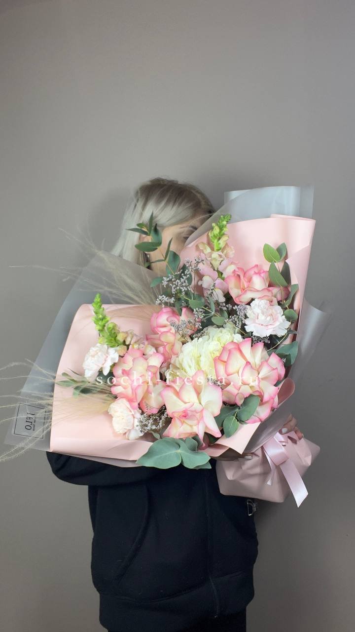 гортензия, гвоздика, статица (или аналог), роза, эустома, дизайнерская пленка, лента.