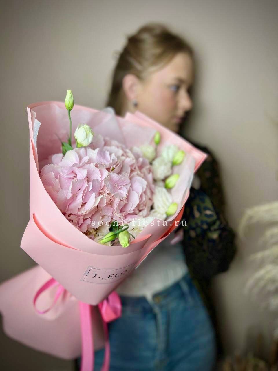Пышные шапки гортензии и густые бутоны пионовидных роз в розовой гамме. Пампасная трава привносит текстурный акцент и делает композицию объёмной.