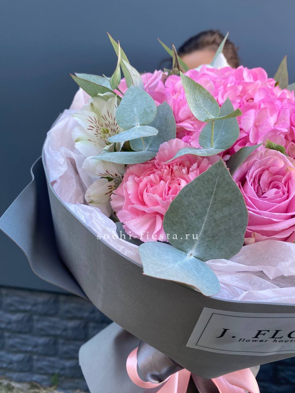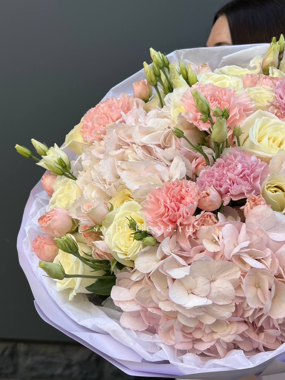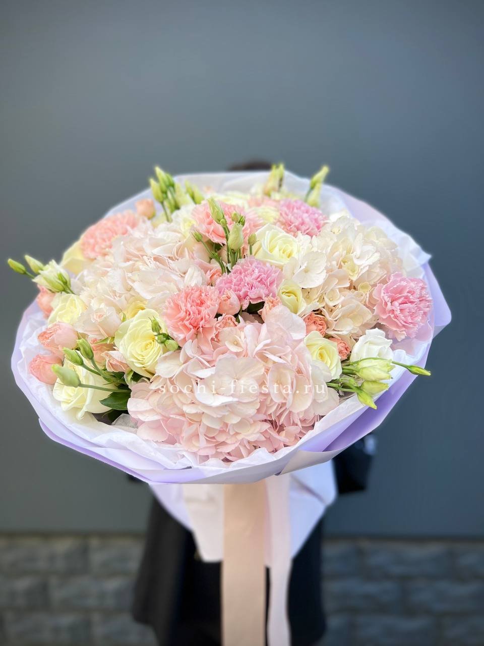 Лёгкая композиция с гортензией и гвоздикой дарит ощущение весеннего утра. Цветы подобраны так, что букет выглядит непринуждённо и свободно.