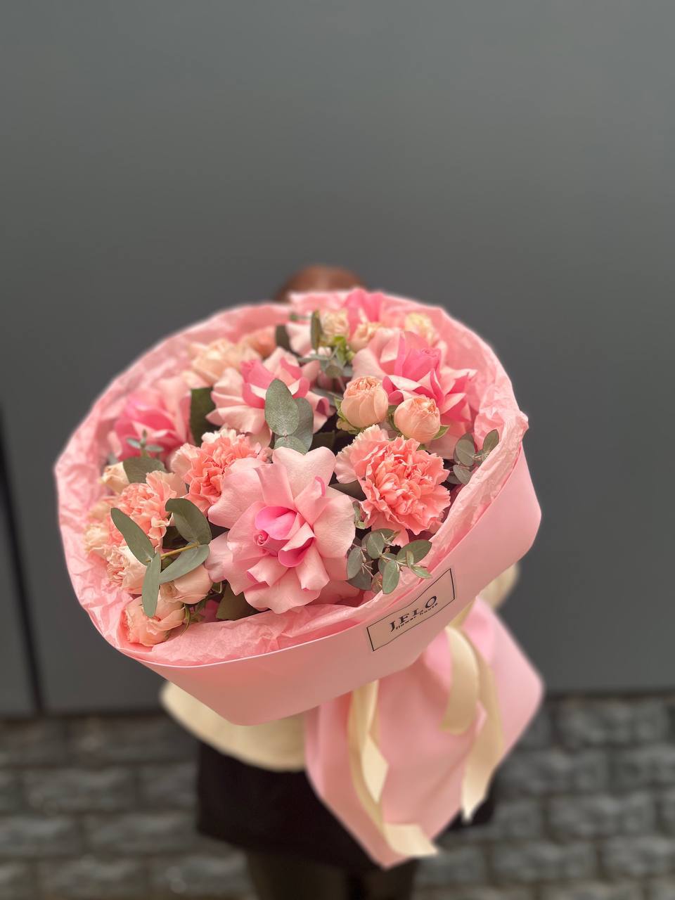 Диантусы и кустовые розы создают воздушную композицию с мягкими переходами оттенков. Бутоны распределены свободно, образуя естественный силуэт без жесткой геометрии. Букет хорошо держит форму и долго сохраняет свежесть.